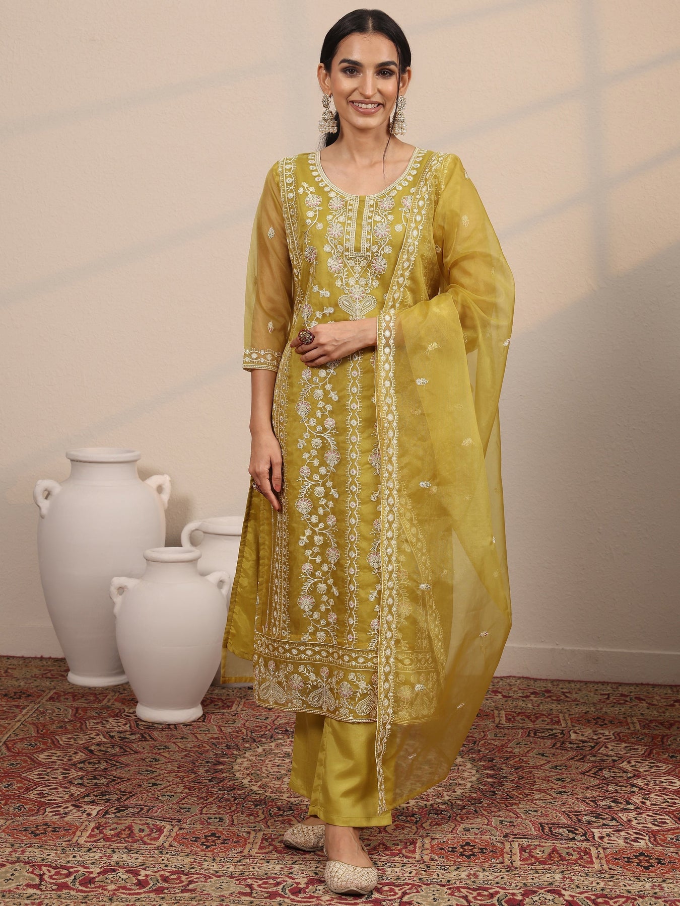 Mustard Embroidered Organza Straight Suit Set With Dupatta