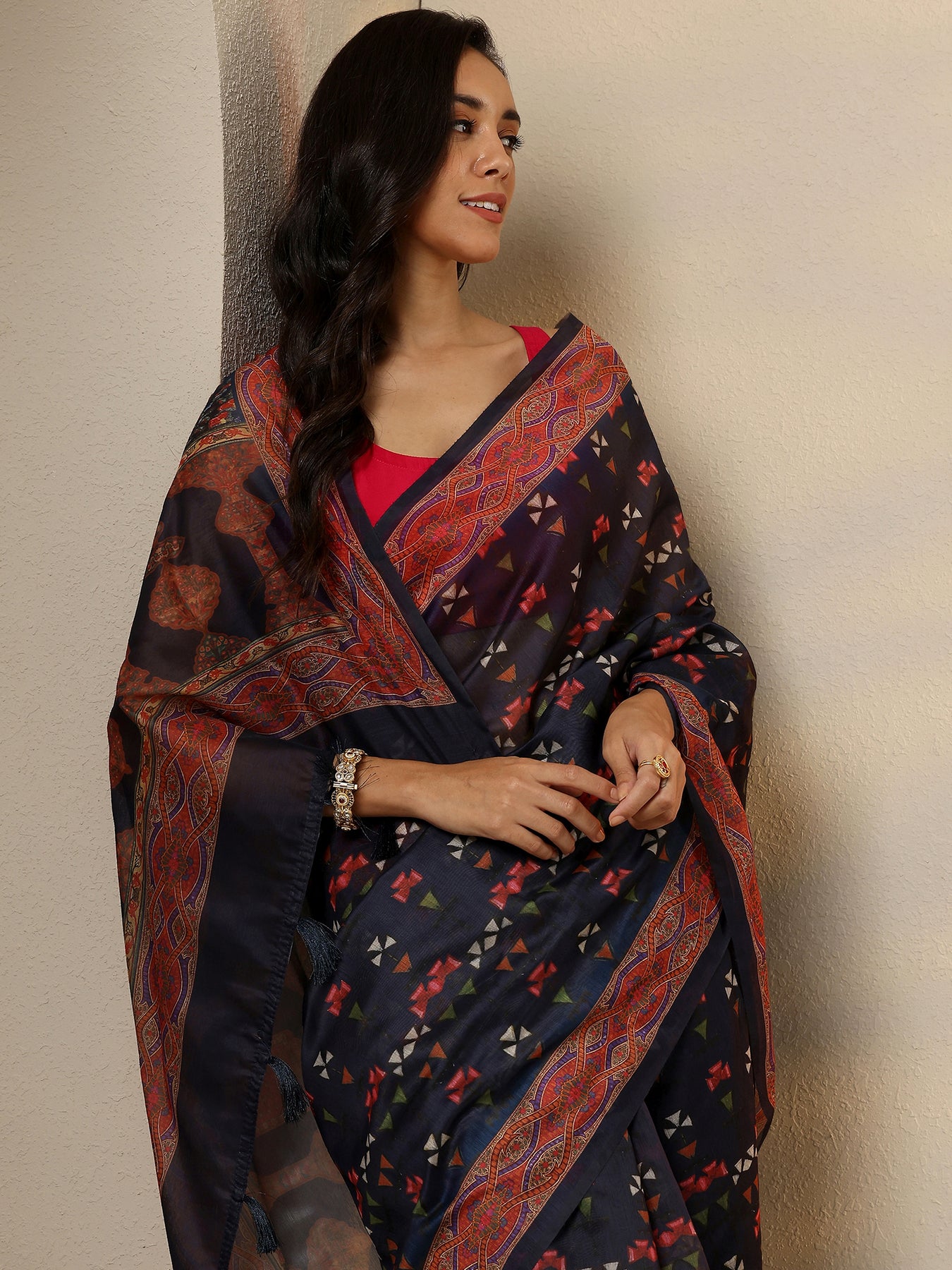 Navy Blue Printed Silk Blend Saree With Unstitched Blouse Piece