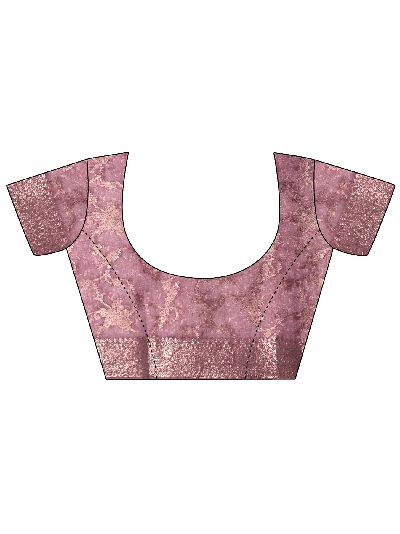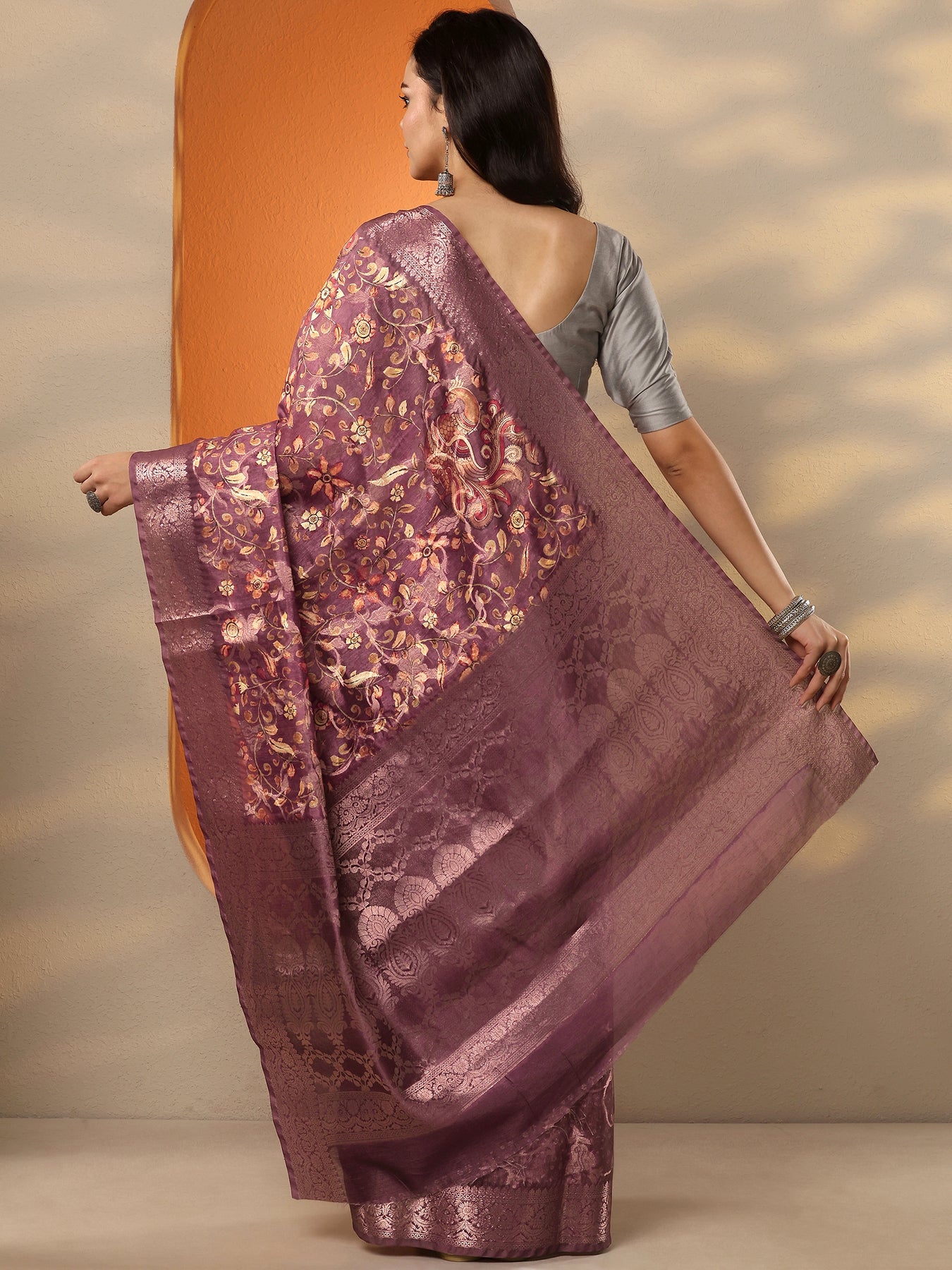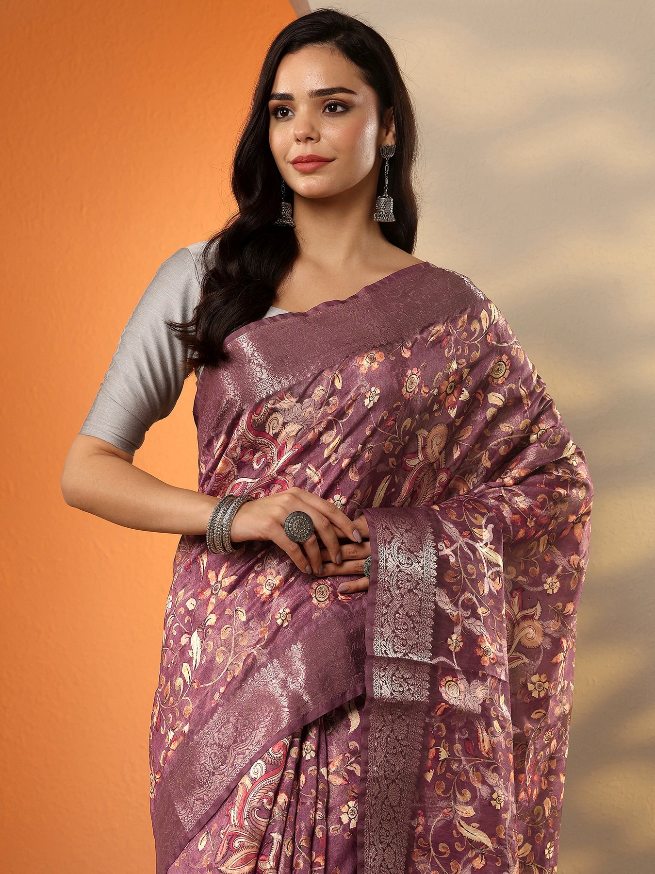 Purple Printed Silk Blend Saree With Unstitched Blouse Piece