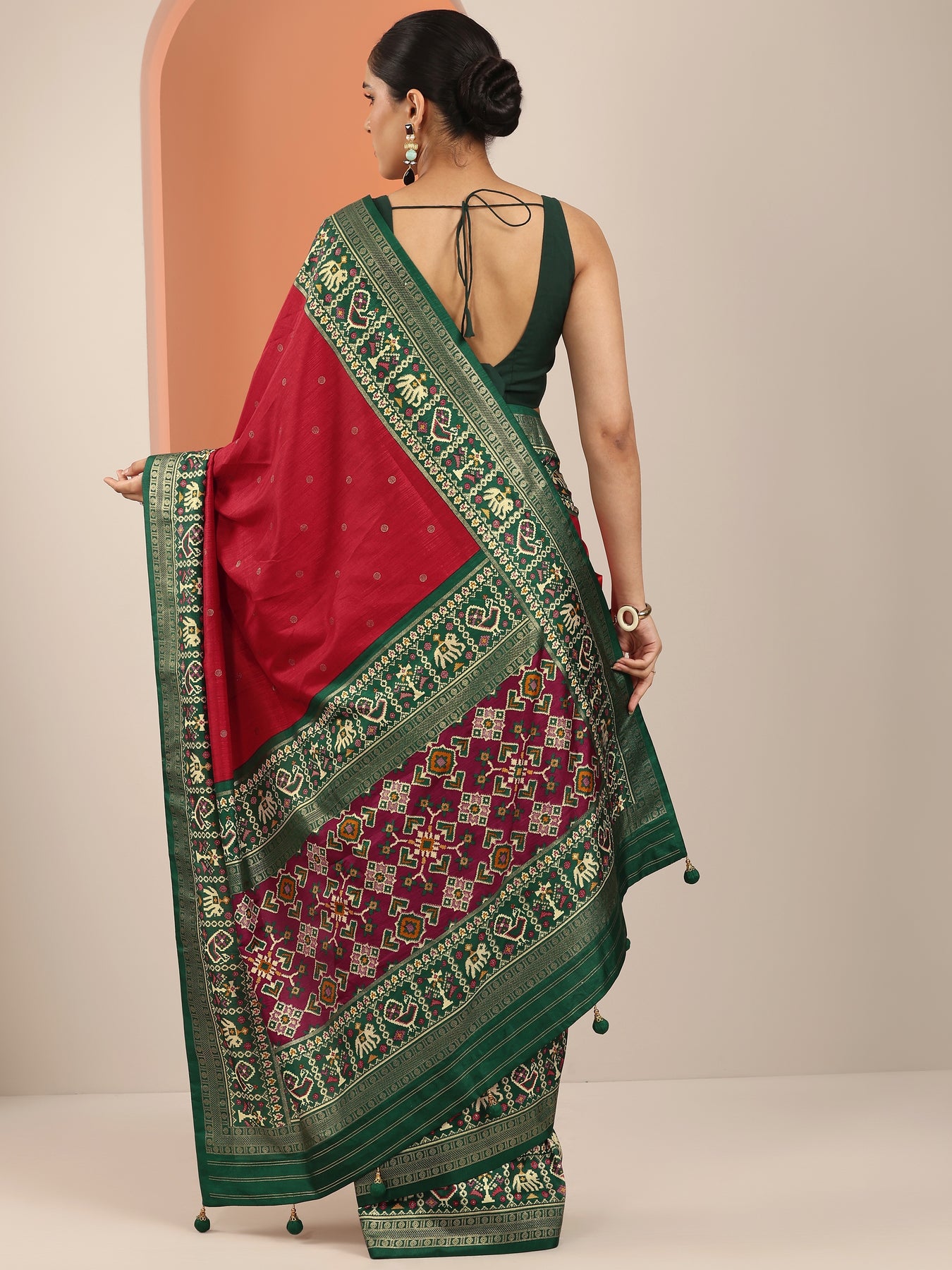 Our Red Printed Silk Blend Saree Features Captivating Zari Embellished Print. Complemented With A Unstitched Blouse Piece. This Charming Saree Is Perfect For Festive Wear