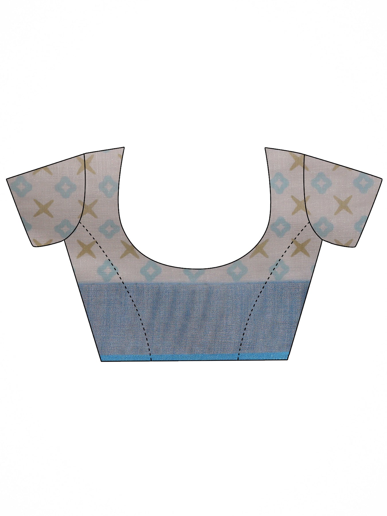 White Printed Cotton Blend Saree With Unstitched Blouse Piece