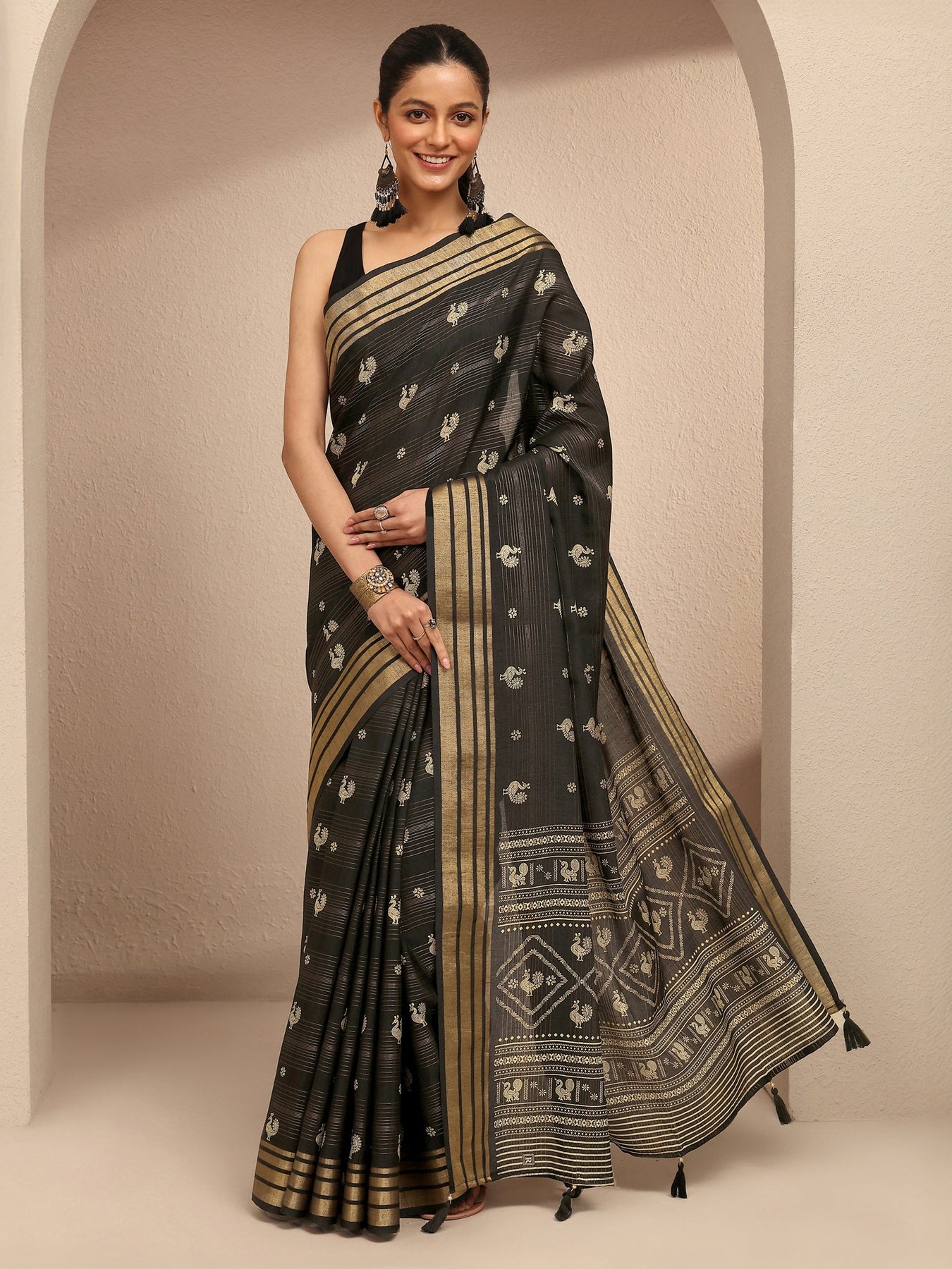 Our black silk blend saree features captivating ethnic motif print. Complemented with an unstitched blouse piece. This charming saree is perfect for festive occasions.