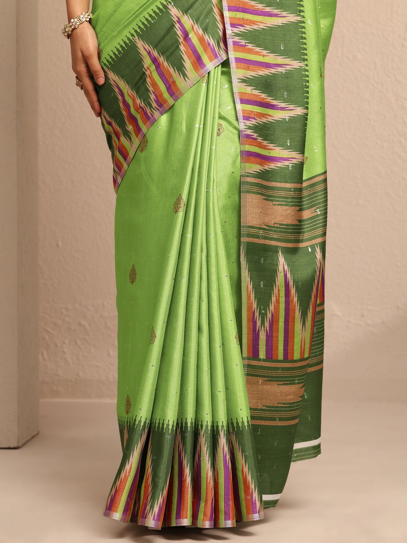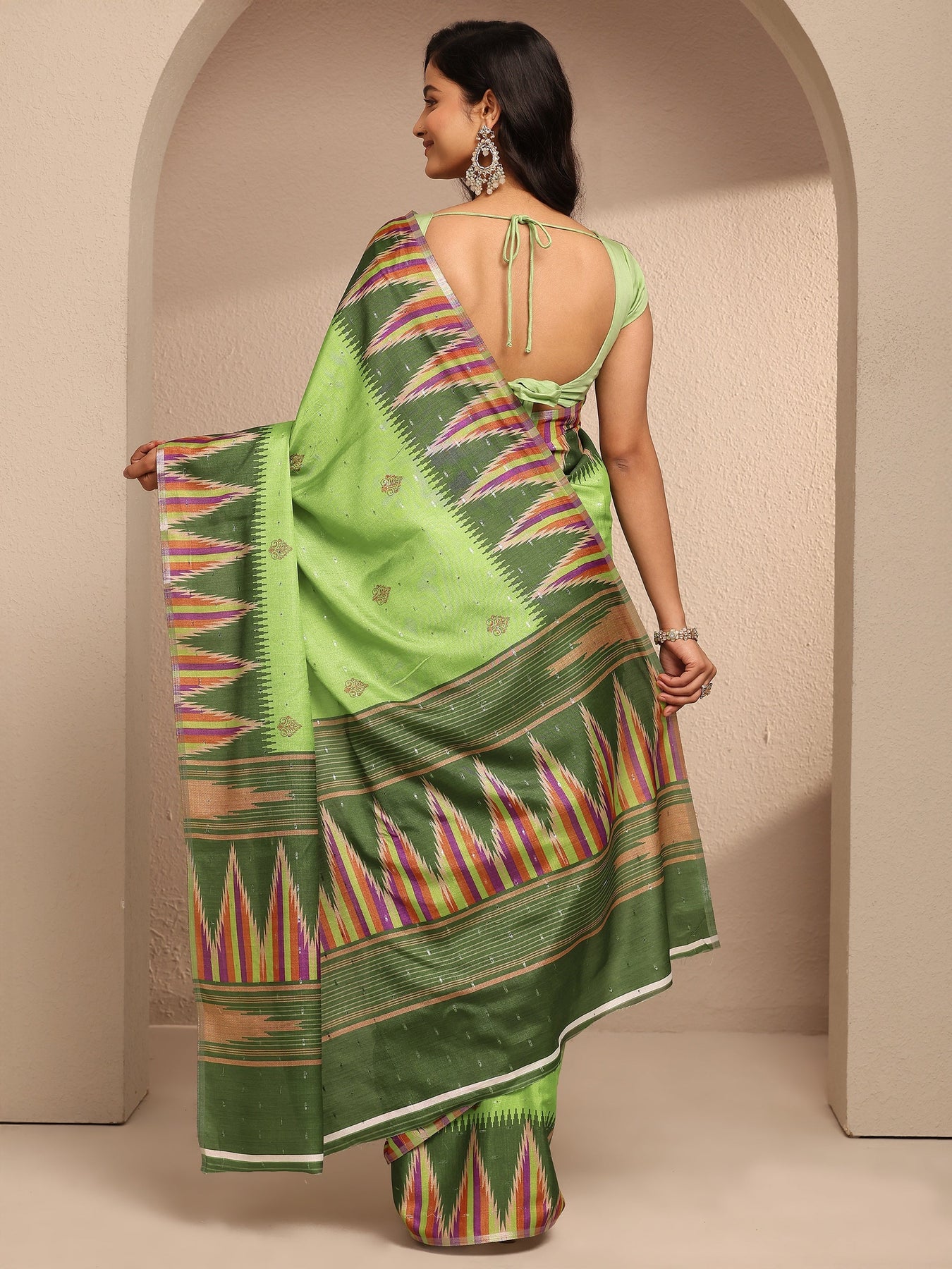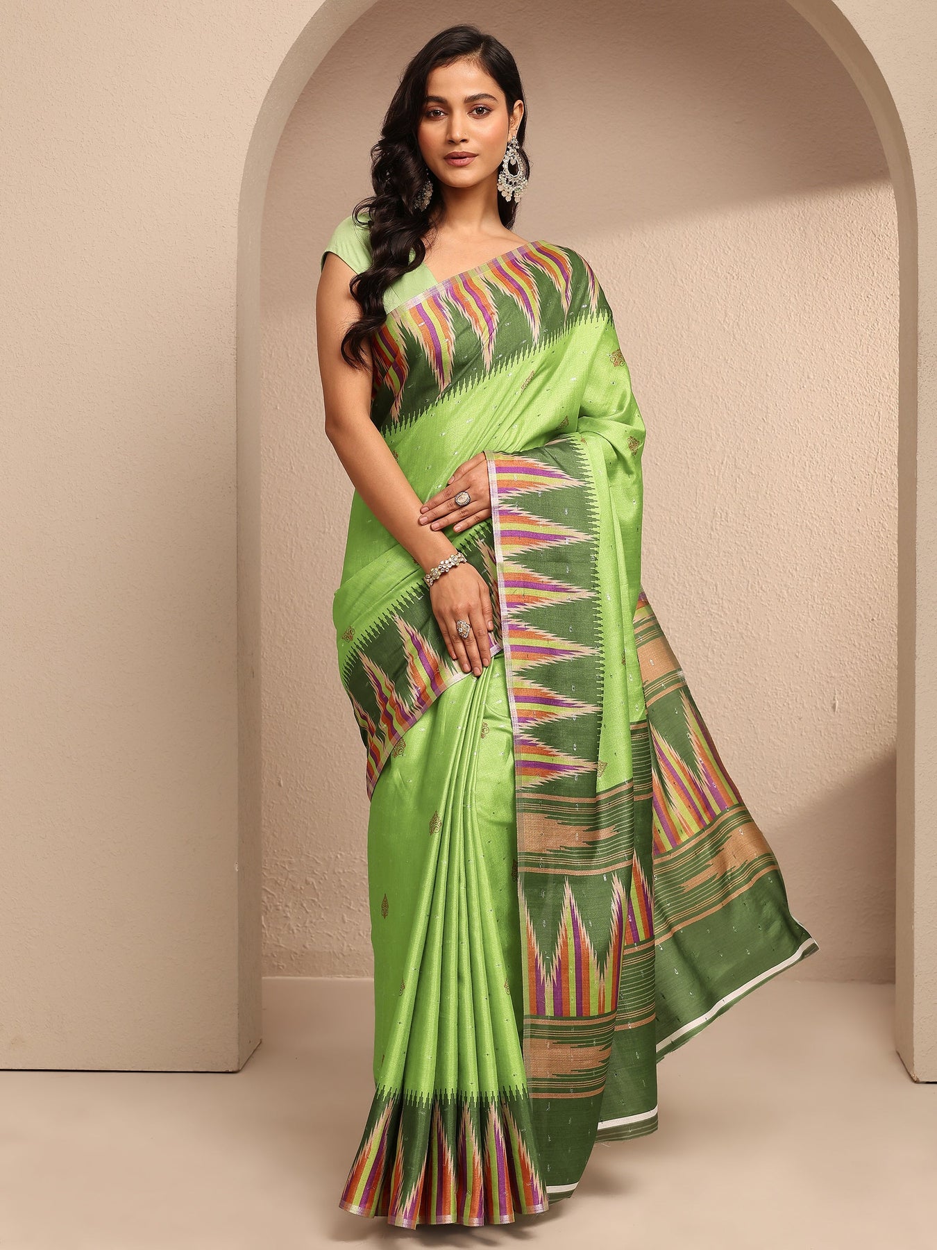 Green Ikat Printed Silk Blend Saree With Unstitched Blouse Piece