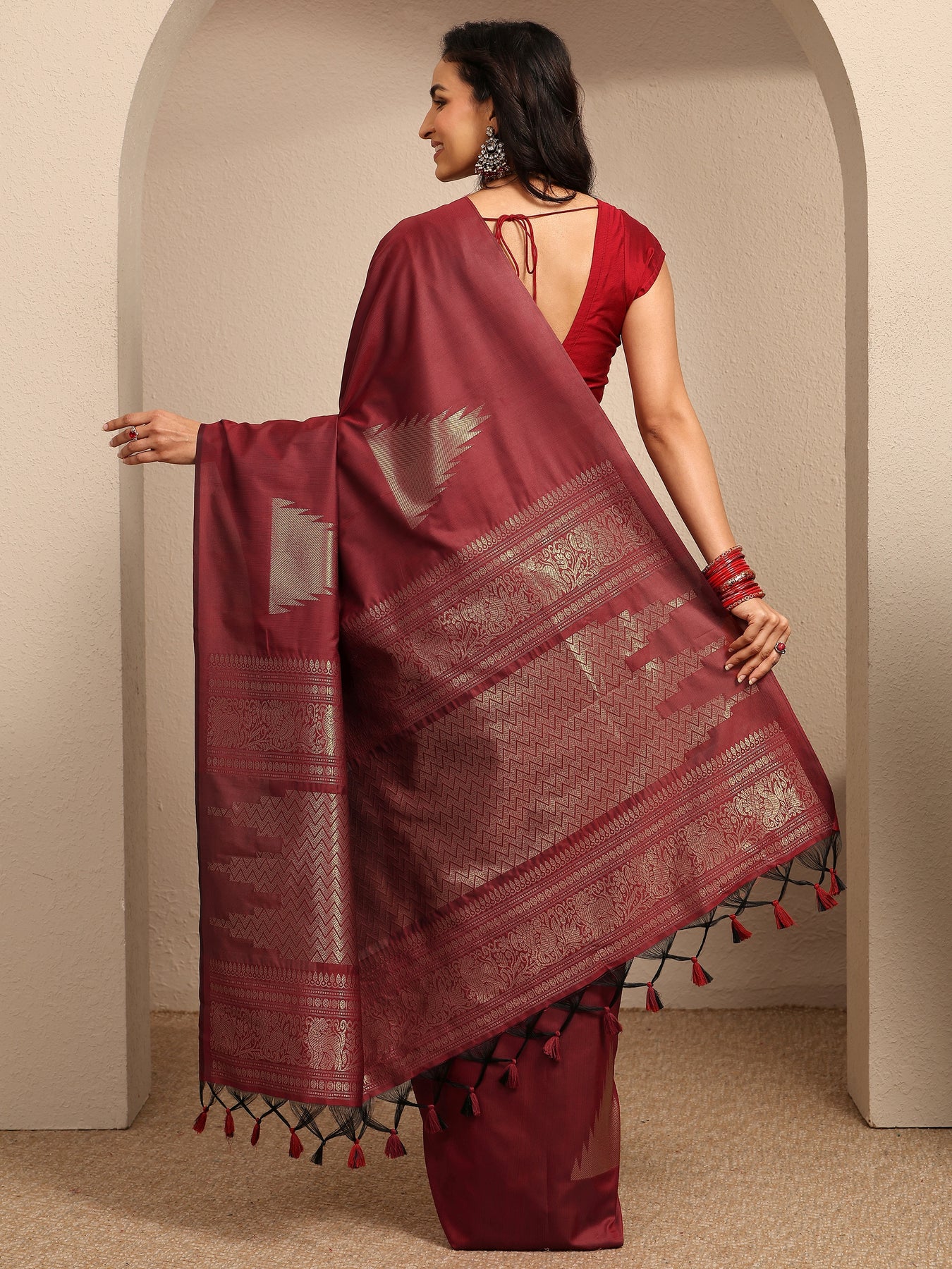 Maroon Solid Silk Blend Saree With Unstitched Blouse Piece