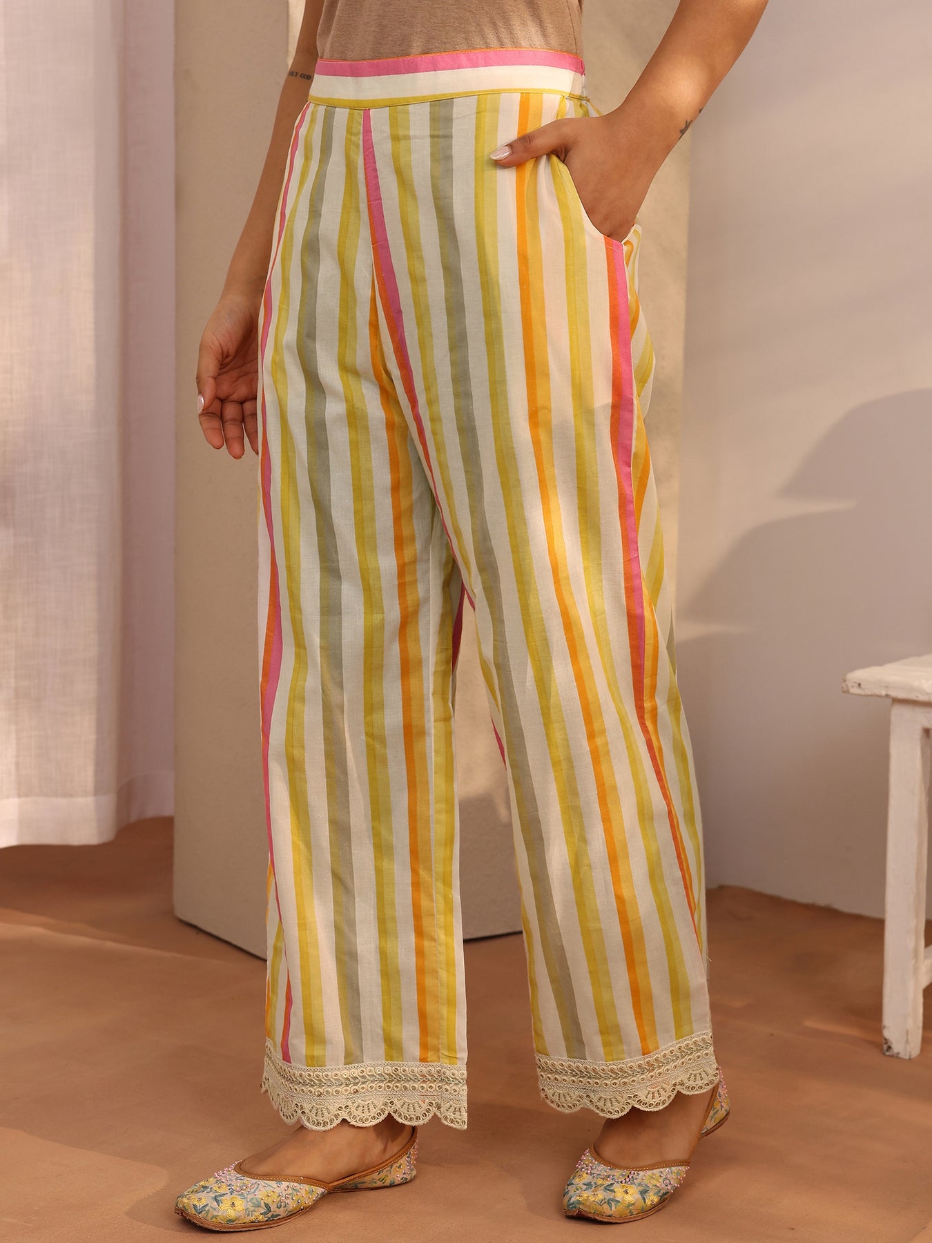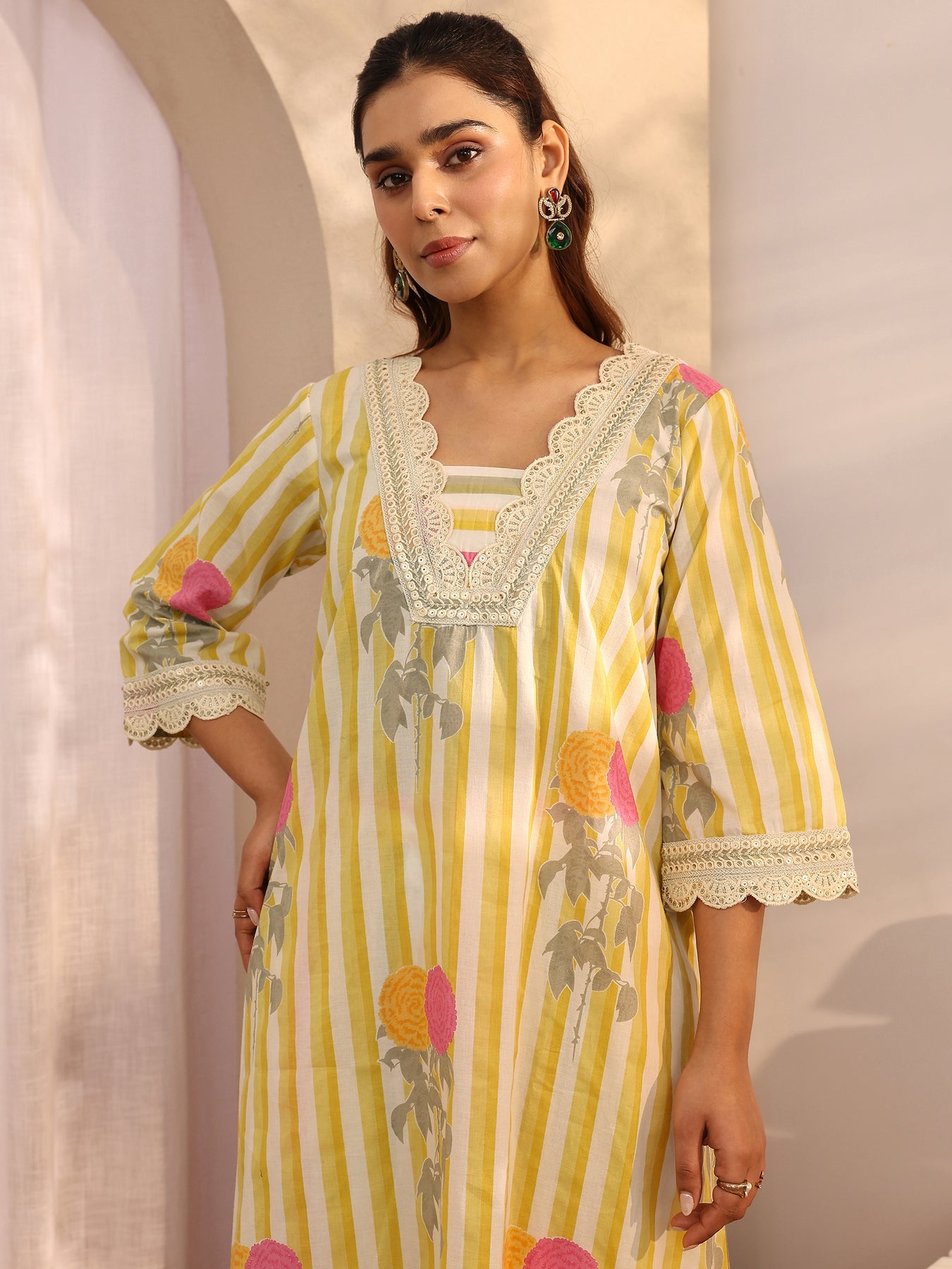 Our 3-piece yellow cotton straight-fit kurta set features a round neckline, regular sleeves, and statement yoke. Complemented with straight pants with a partially elasticated waistband and 2 pockets, and a printed dupatta. Adorned with floral printed, this style is perfect for festive occasions.