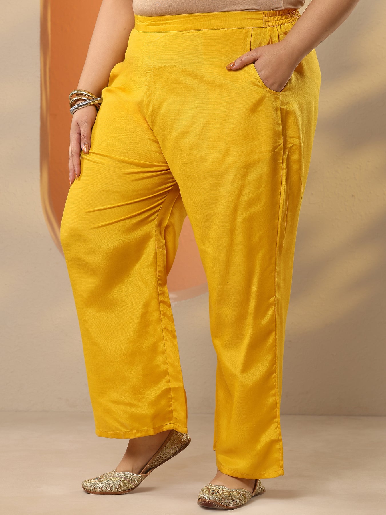 Plus Size Yellow Printed Silk Blend Straight Suit Set With Dupatta