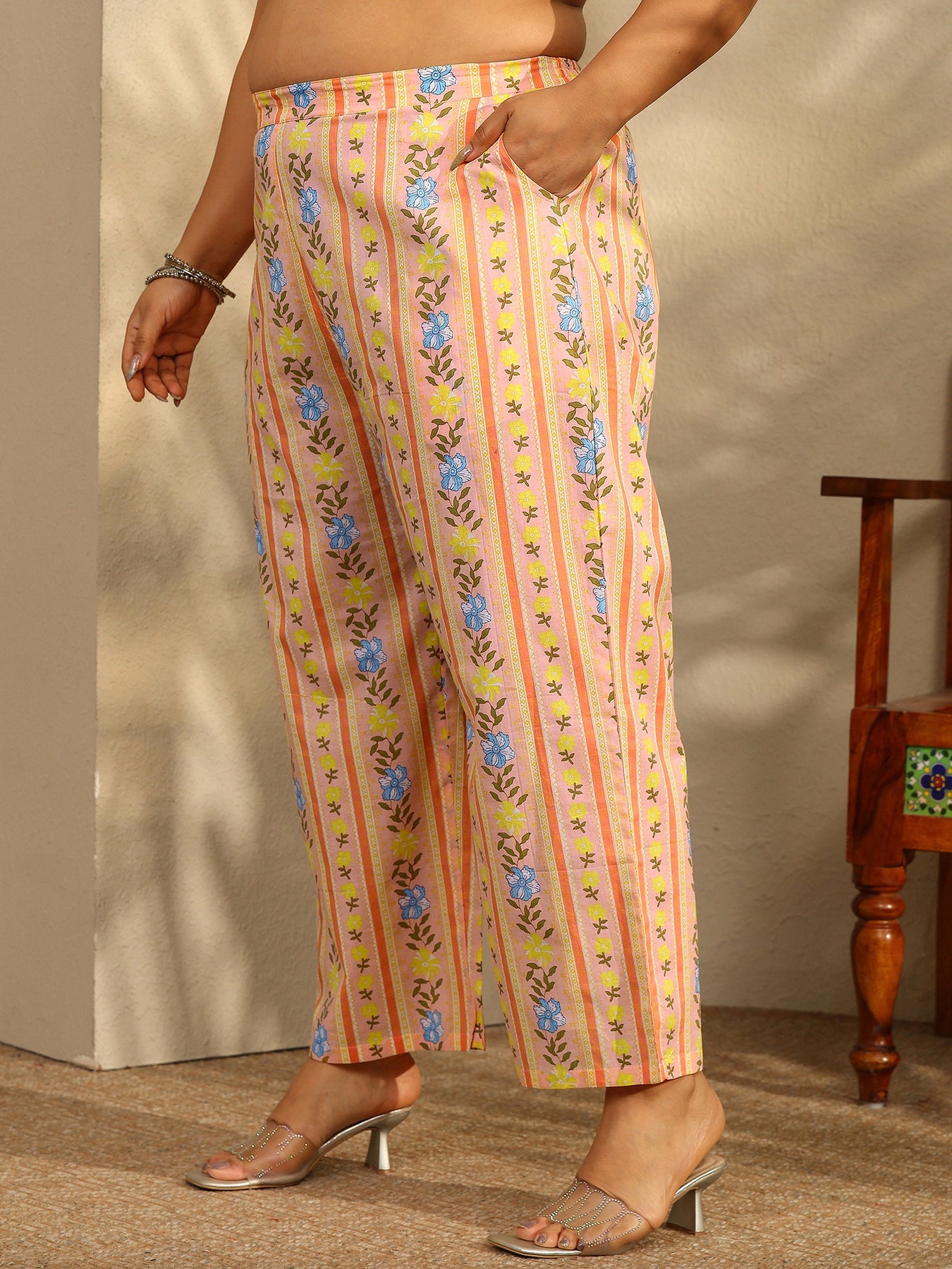 Our 3-piece pink cotton straight-fit kurta set features a V-neckline, regular sleeves, and statement yoke. Complemented with palazzo pants with a partially elasticated waistband and 2 pockets, and a floral dupatta. Adorned with floral printed, this style is perfect for festive occasions.