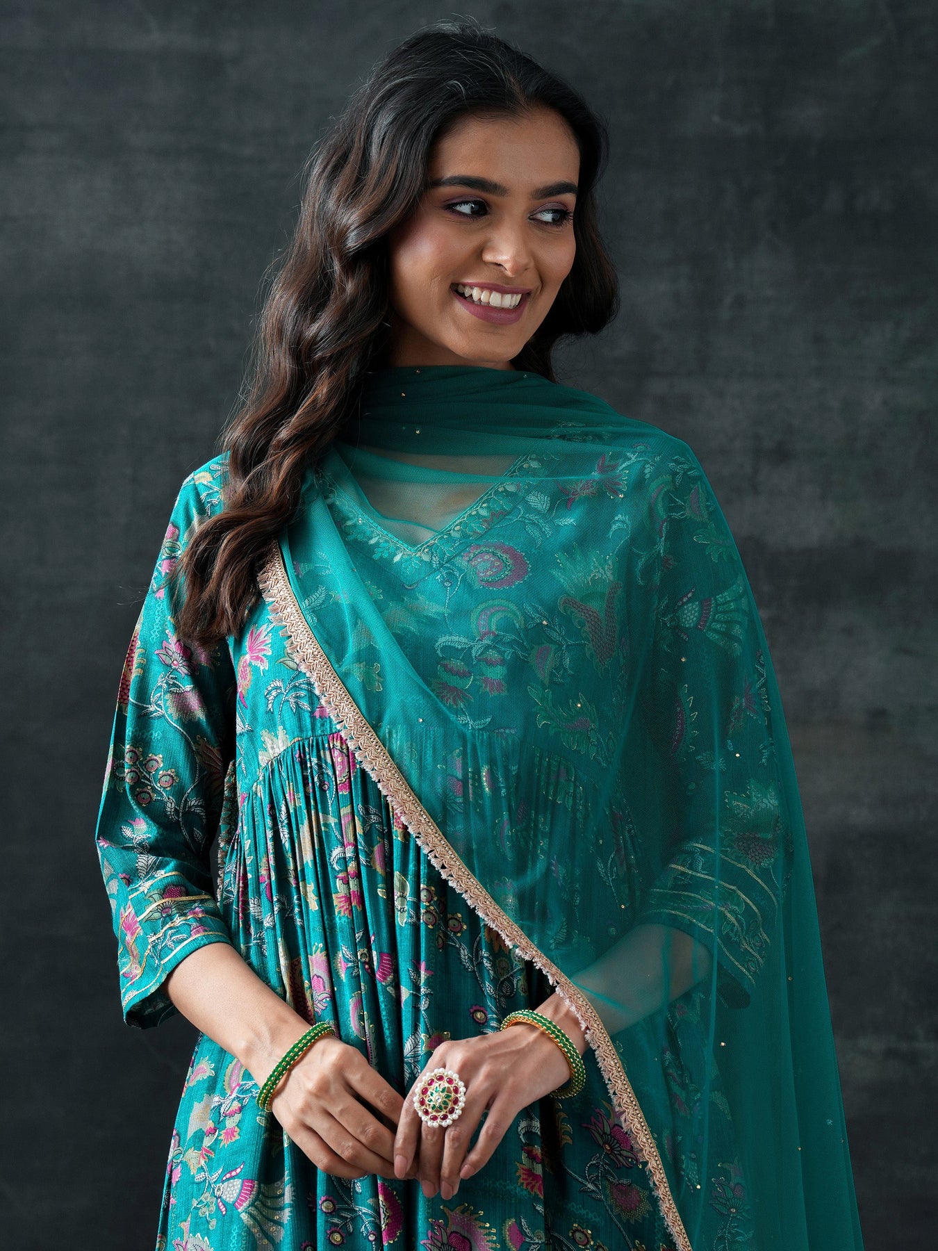 Teal Printed Silk Blend Anarkali Suit Set With Dupatta