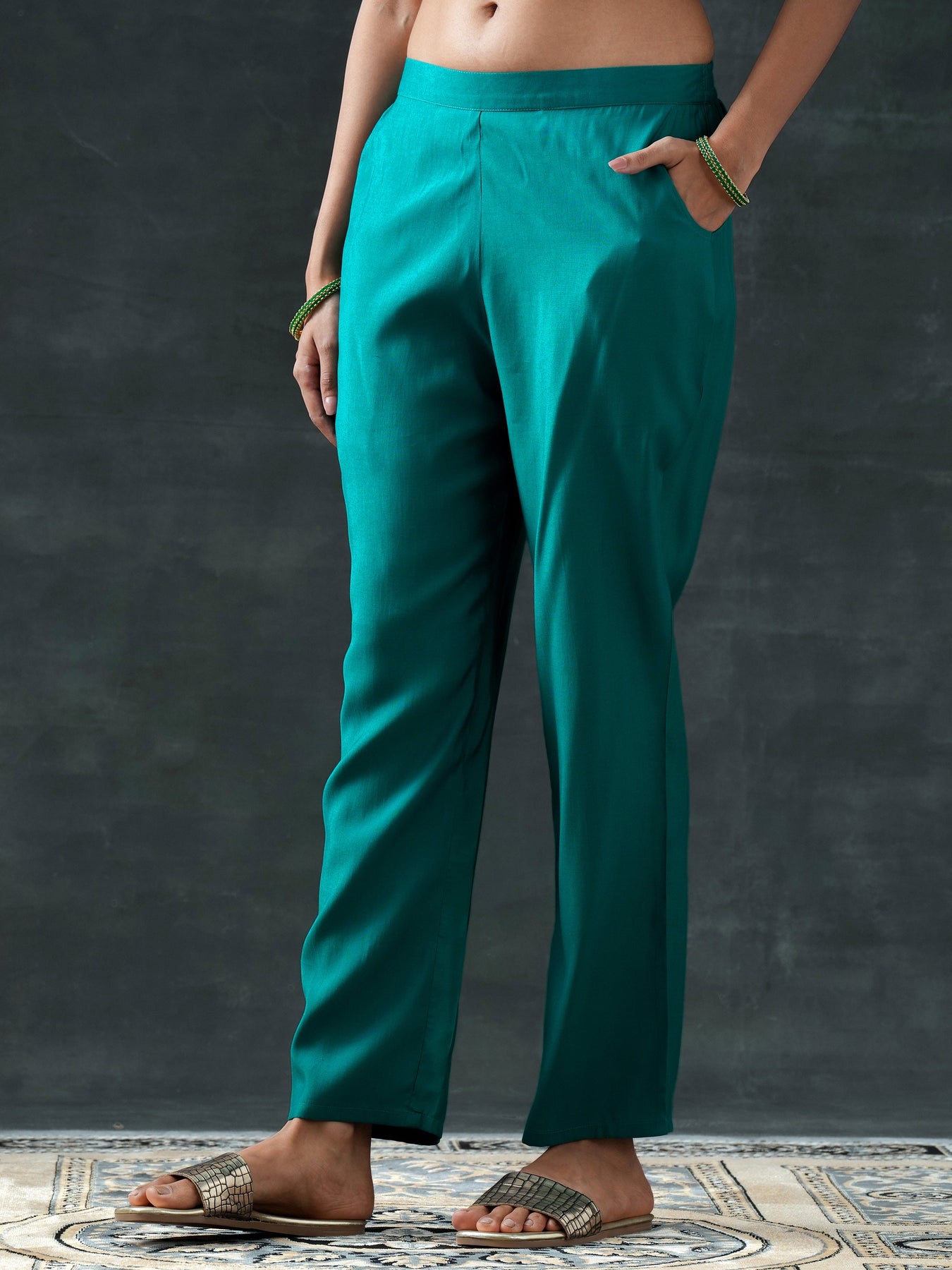Our 3-piece teal silk blend Anarkali kurta set features a round neckline, regular sleeves, and a statement yoke. Complemented with straight pants with a partially elasticated waistband and 2 pockets, and a printed dupatta. Adorned with floral printed accents, this style is perfect for festive wear.