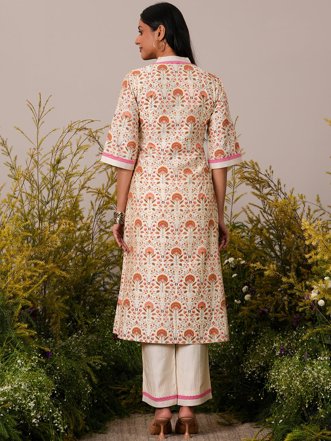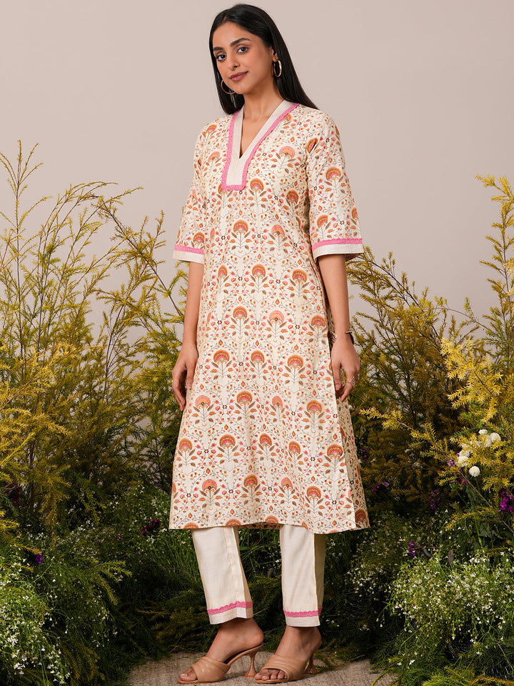 Our 2-piece beige printed Chanderi silk kurta set features a straight-fit kurta with a V-neckline and three-quarter flared sleeves. Complemented with trousers with a partially elasticated waistband and roomy pockets. Adorned with captivating floral prints and lace detailing, this style is perfect for casual outings.