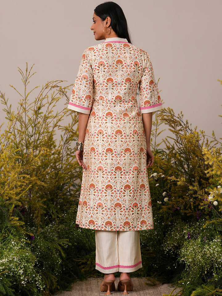 Beige Printed Chanderi Silk A-Line Kurta With Palazzos