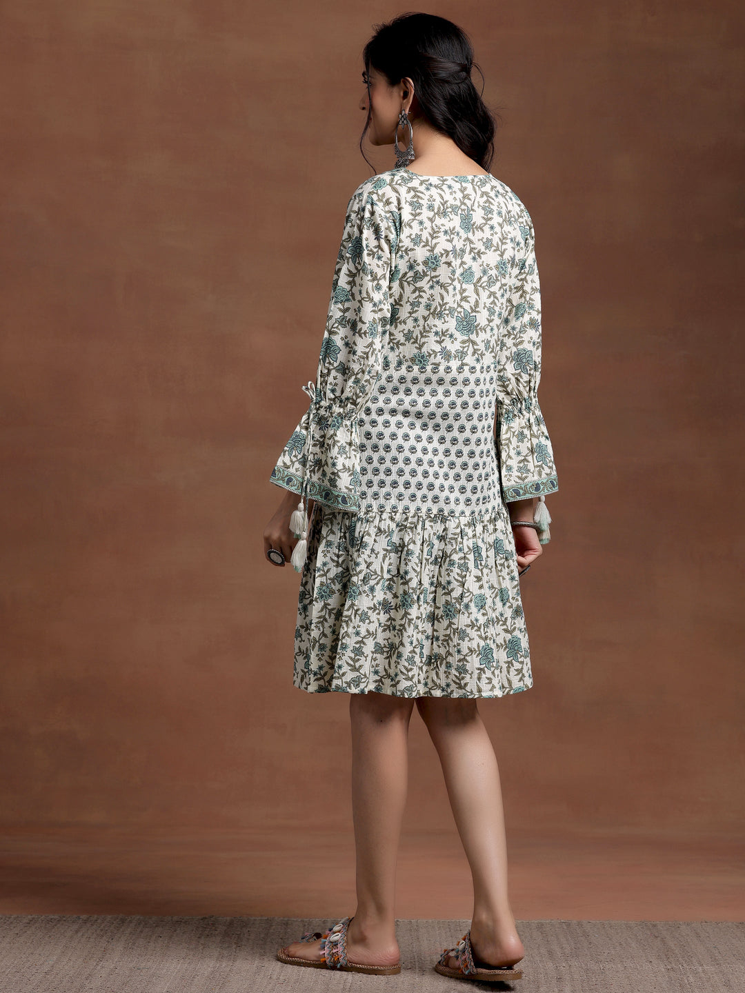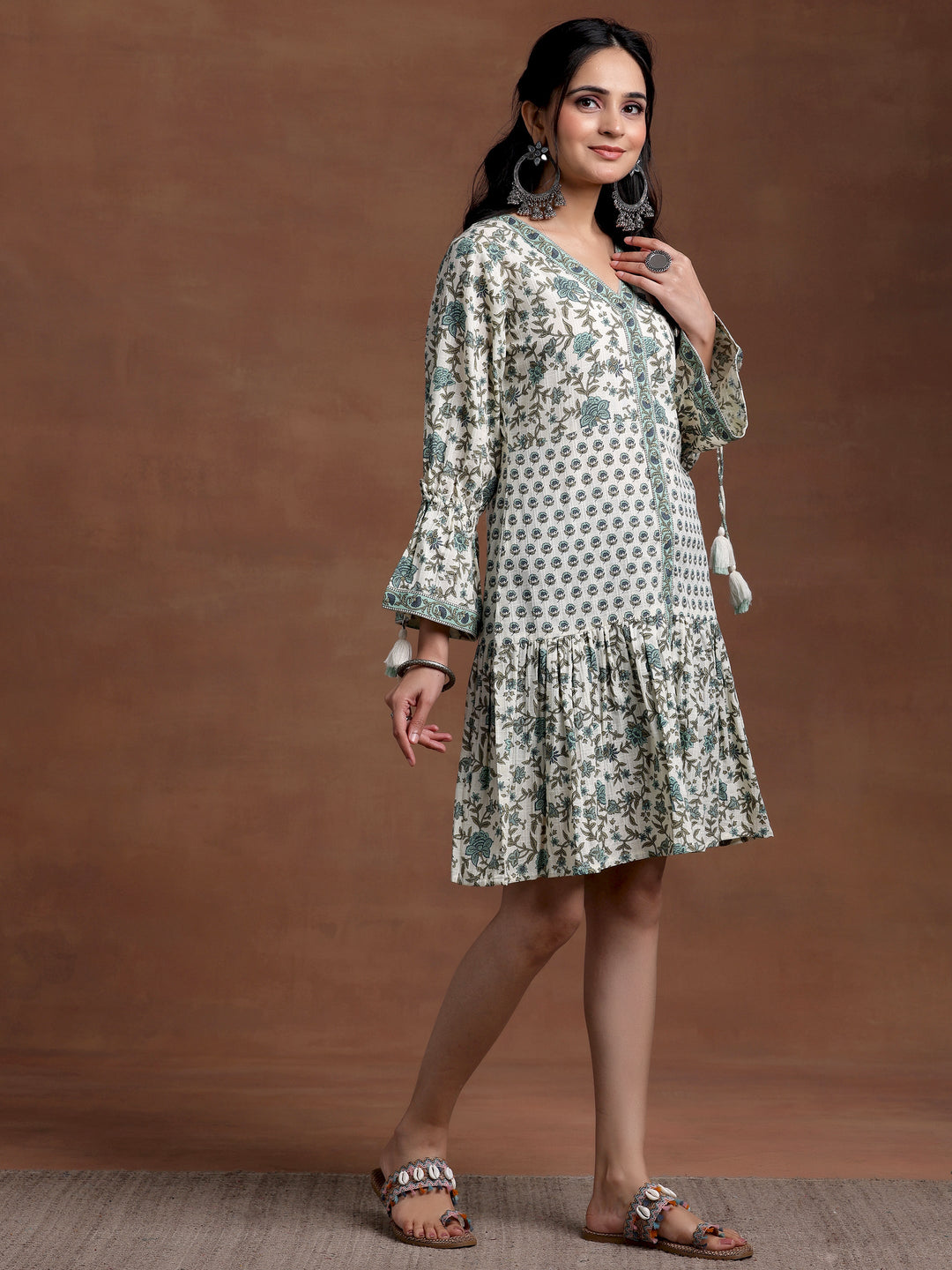 Our beige printed cotton A-line dress features a V-neckline and long bell sleeves with tie-up detailing. Elevated with charming floral prints and fabric-trim detailing, this stylish dress is perfect for casual outings.