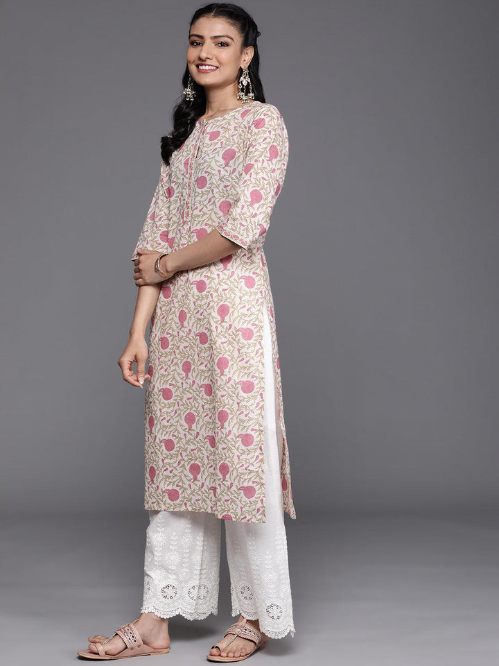 Our beige floral print straight fit kurta features a round neckline and three-quarter sleeves. Highlighted with delicate fabric-trim accents, this versatile style is ideal elevated everyday wear.