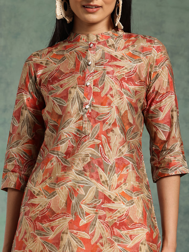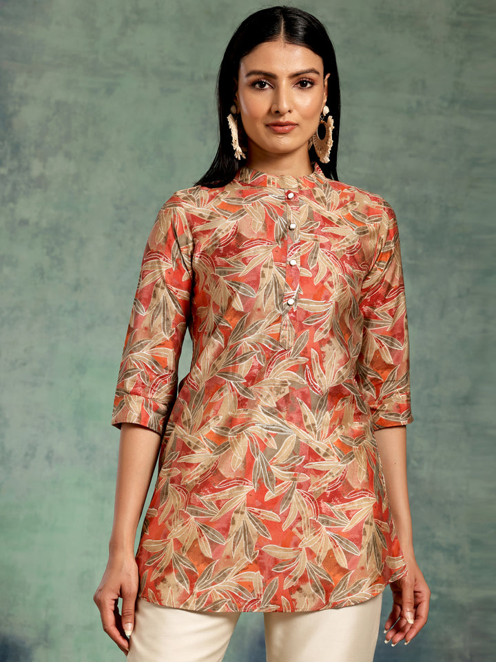 Our beige printed silk blend kurti features a mandarin collar and three-quarter sleeves. Adorned with captivating foliage prints and stylish buttons, this style is perfect for casual outings.