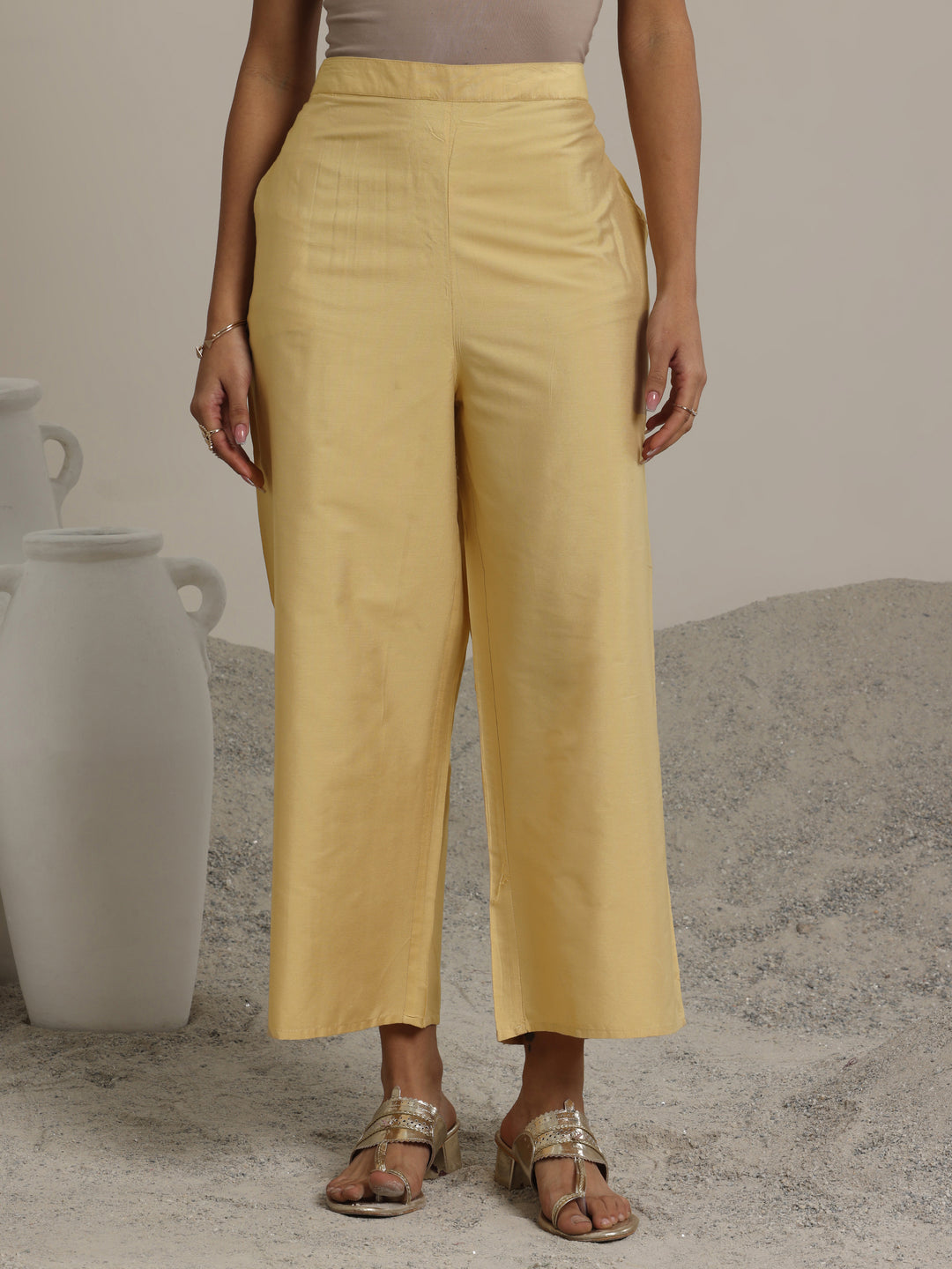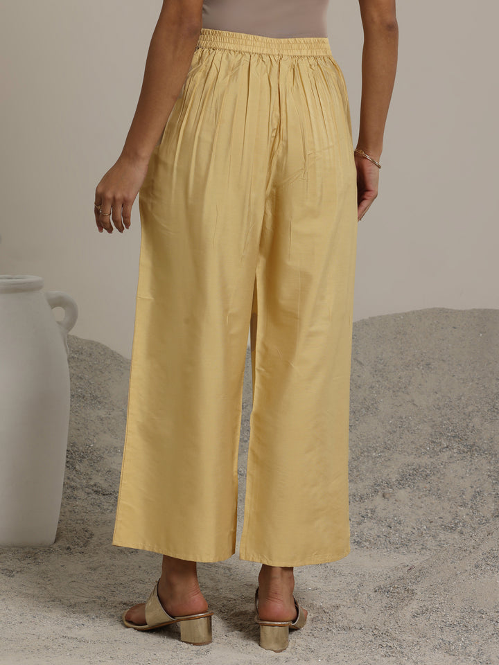 Our beige solid silk palazzos feature a partially elasticated waistband and roomy pockets. Crafted with attention to detail, this style is perfect for casual outings.