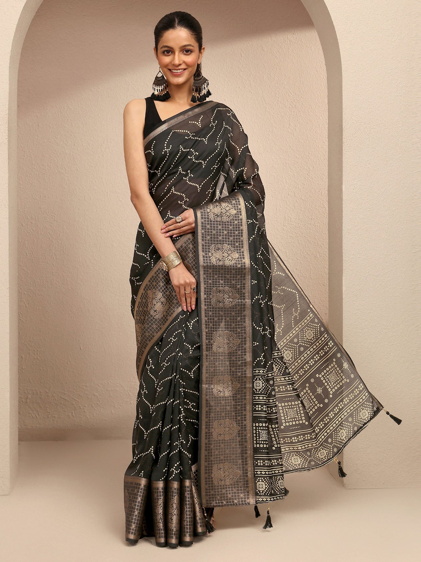 Black Bandhani Printed Silk Blend Saree With Unstitched Blouse Piece