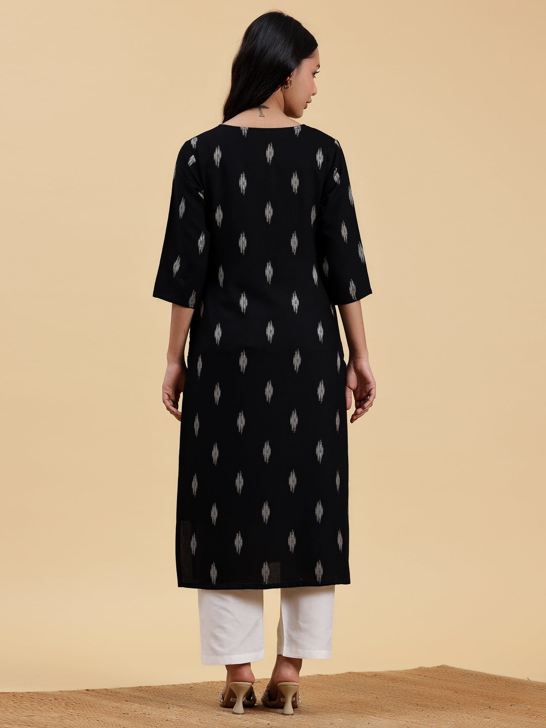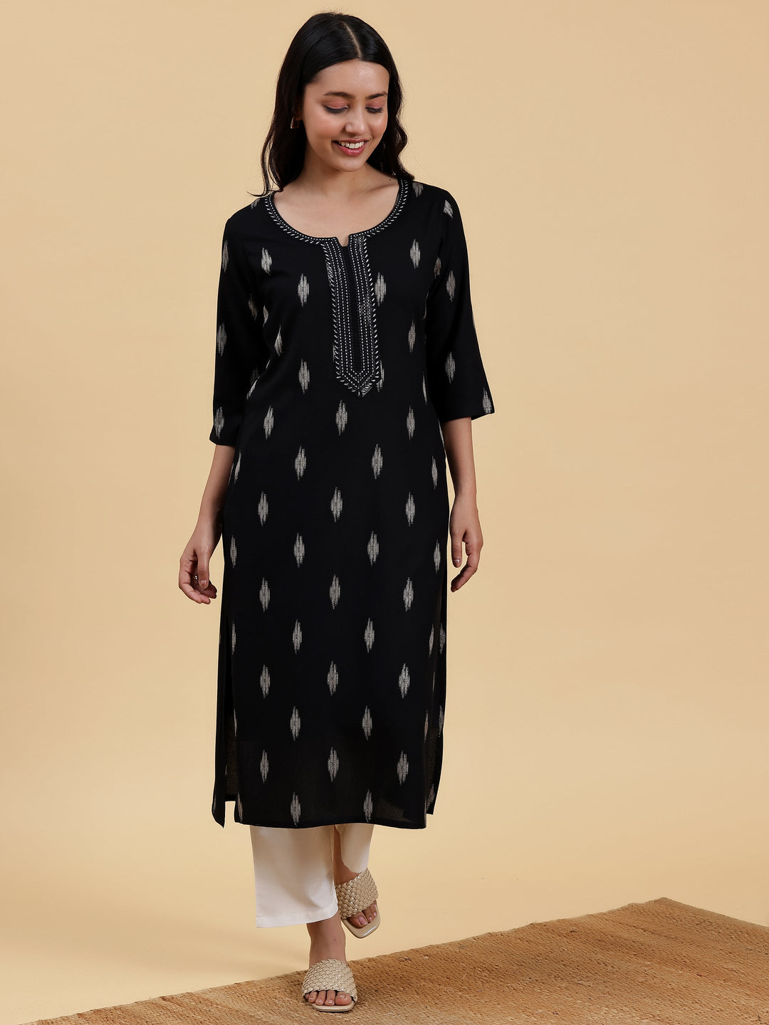 Our black woven-design straight-fit kurta, crafted in viscose rayon fabric, features a U-notched neckline, three-quarter sleeves, and a statement yoke. Elevated with intricate thread work, this style is perfect for elevated everyday wear.