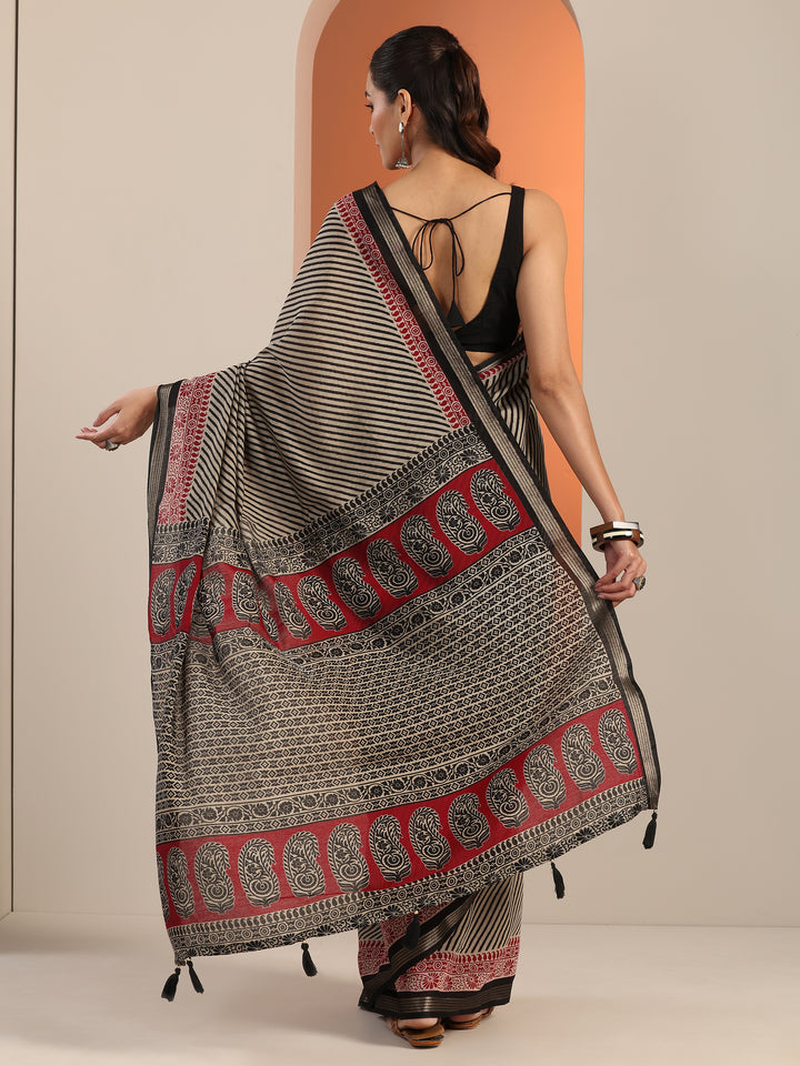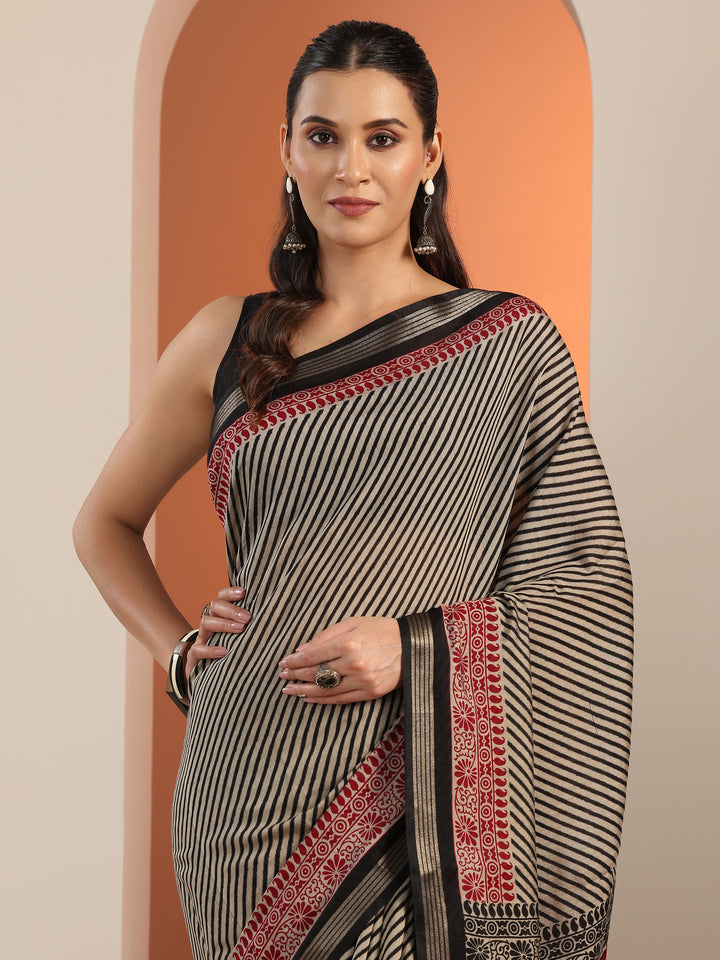 Black Printed Cotton Blend Saree With Unstitched Blouse Piece