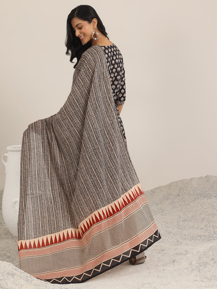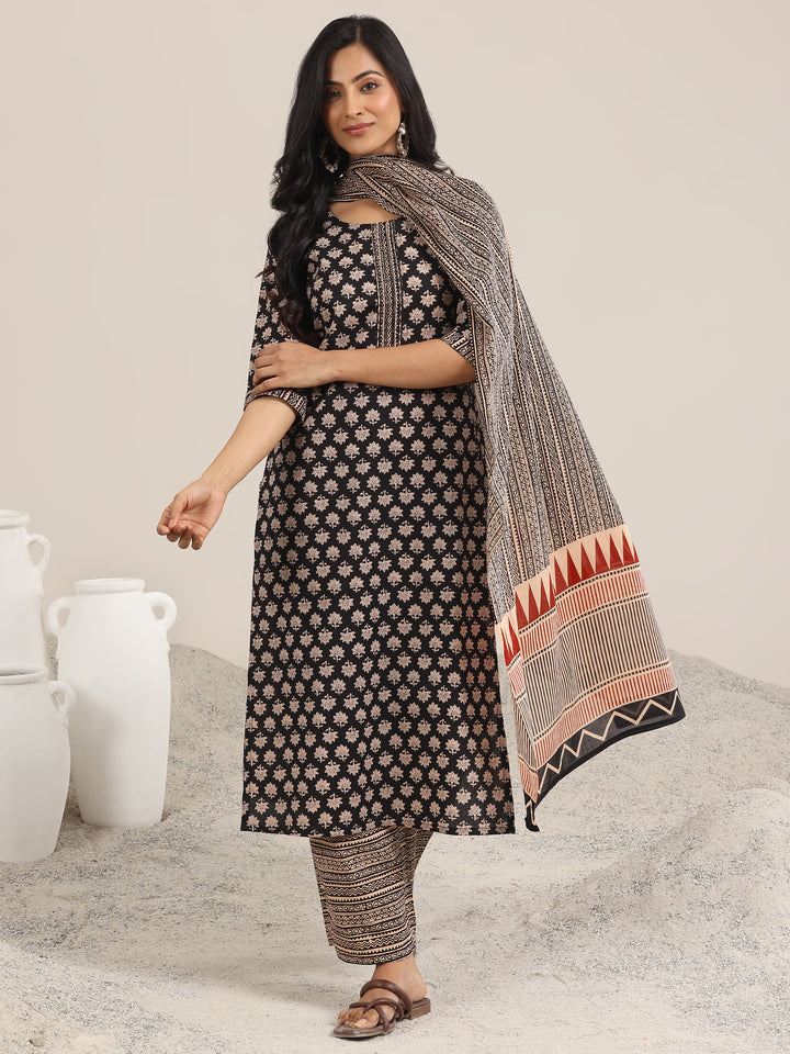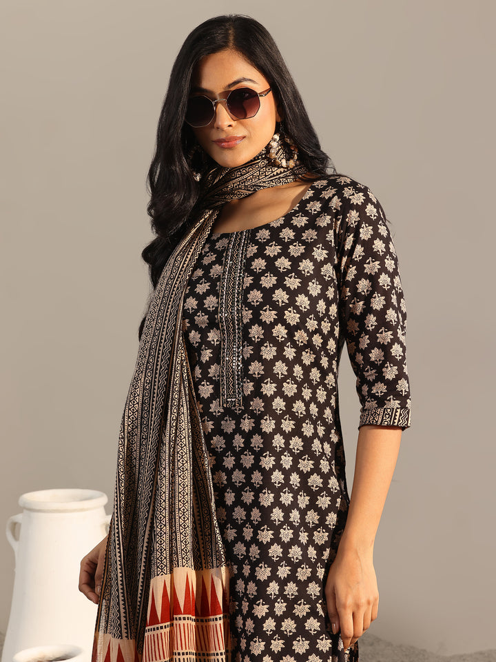 Our 3-piece black printed cotton blend suit set features a kurta with a round neckline and three-quarter sleeves. Complemented with trousers with a partially elasticated waistband and roomy pockets, and a dupatta. Highlighted with sequins and ethnic motifs prints, this style is perfect for elevated everyday style.