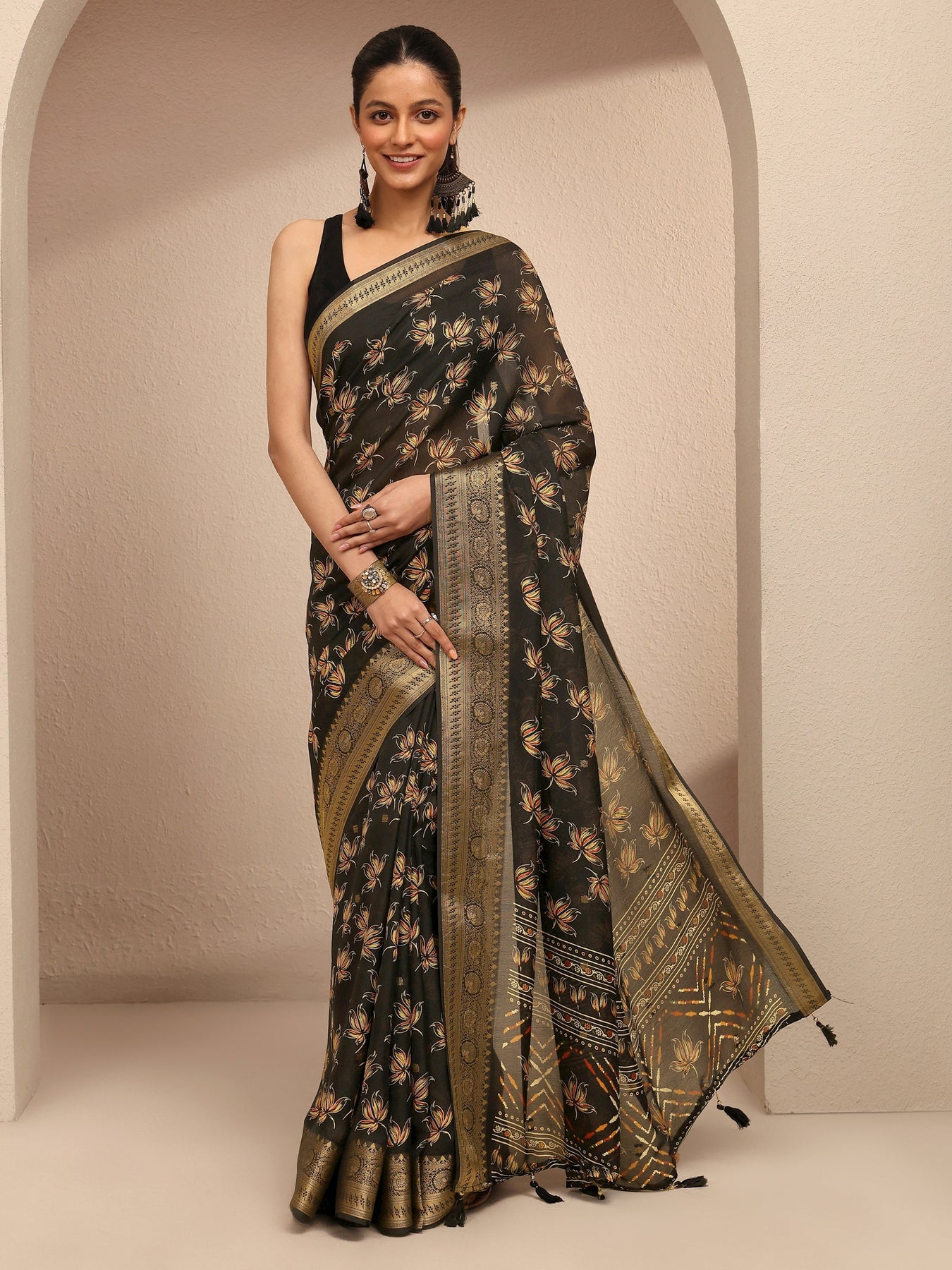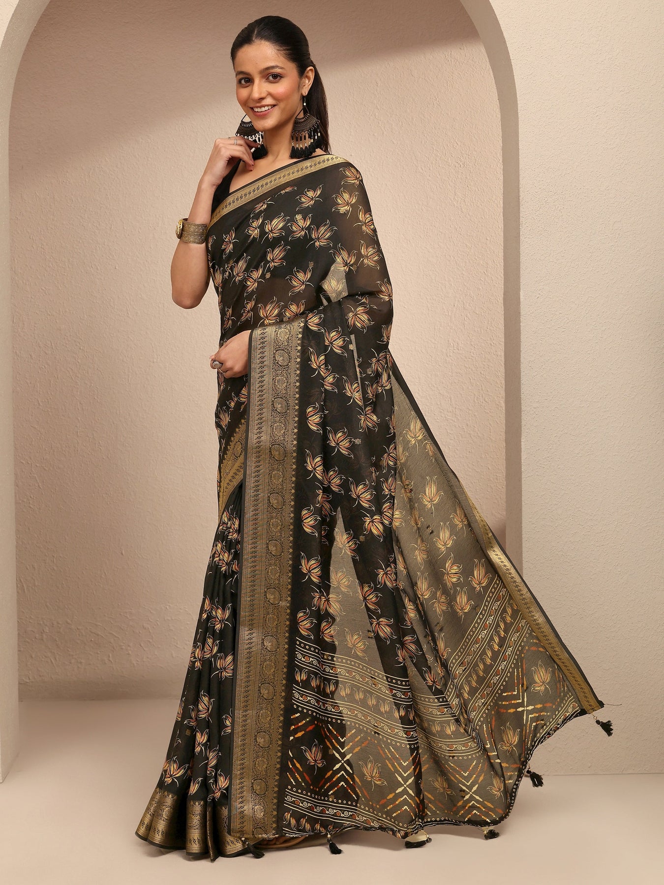 Our black silk blend saree features captivating floral print. Complemented with an unstitched blouse piece. This charming saree is perfect for festive occasions.