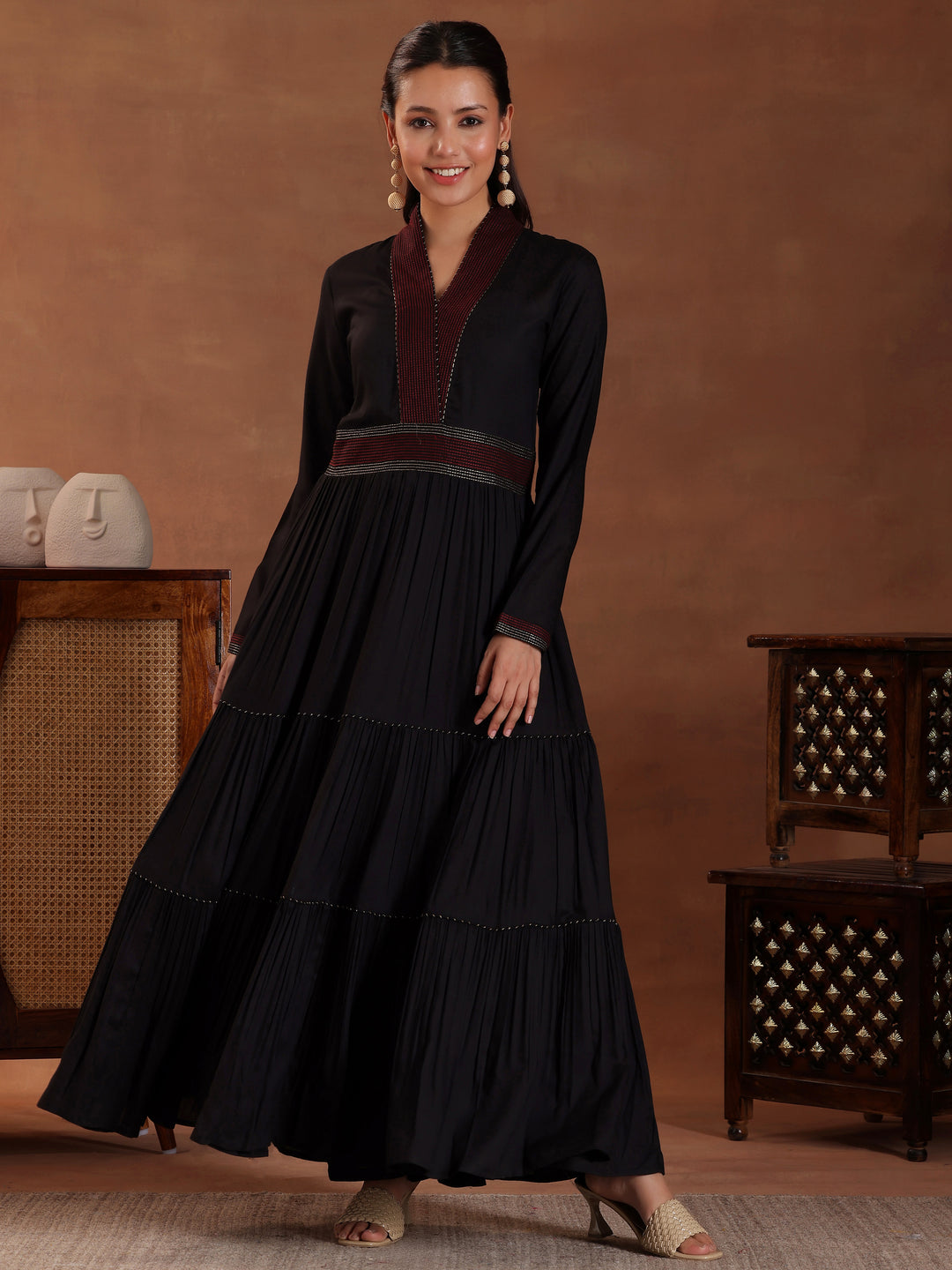 Our 2-piece black rayon kurta set features an Anarkali kurta with a V-neckline, comfortable full sleeves, and tiered hemline. Complemented with trousers with a partially elasticated waistband and roomy pockets. Highlighted with thread work, this style is perfect for casual outings.