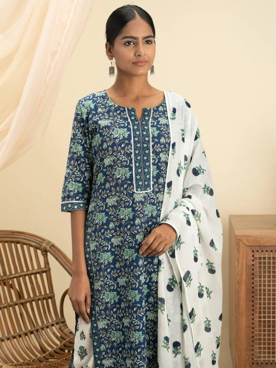 Our 3-piece blue floral print cotton suit set features a straight-fit kurta with a notched neckline and three-quarter sleeves. Complemented with printed trousers with a partially elasticated waistband and roomy pockets, and a dupatta. Adorned with captivating floral print, fabric-trim accents, and Gota Patti detailing, this style is perfect for elevated everyday wear.