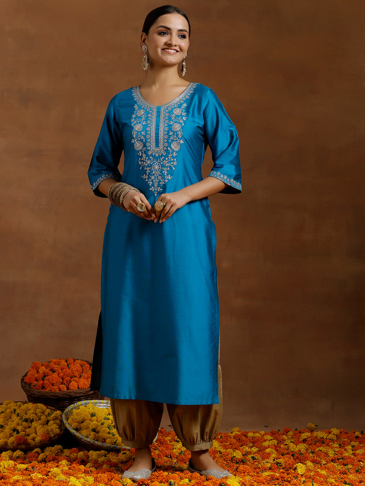 Blue Embroidered Silk Straight Kurta