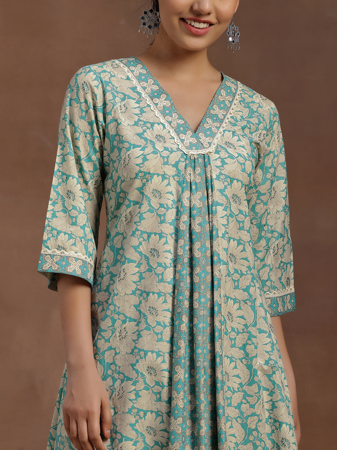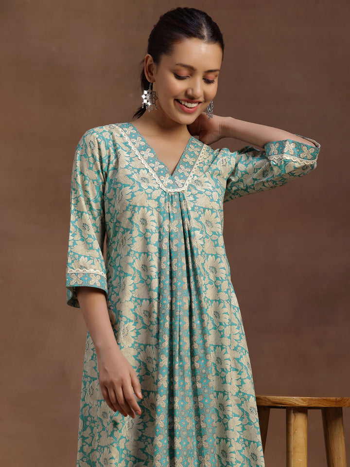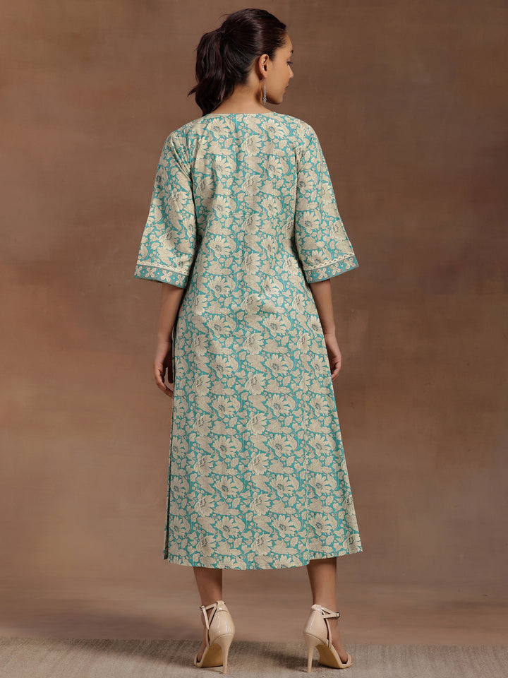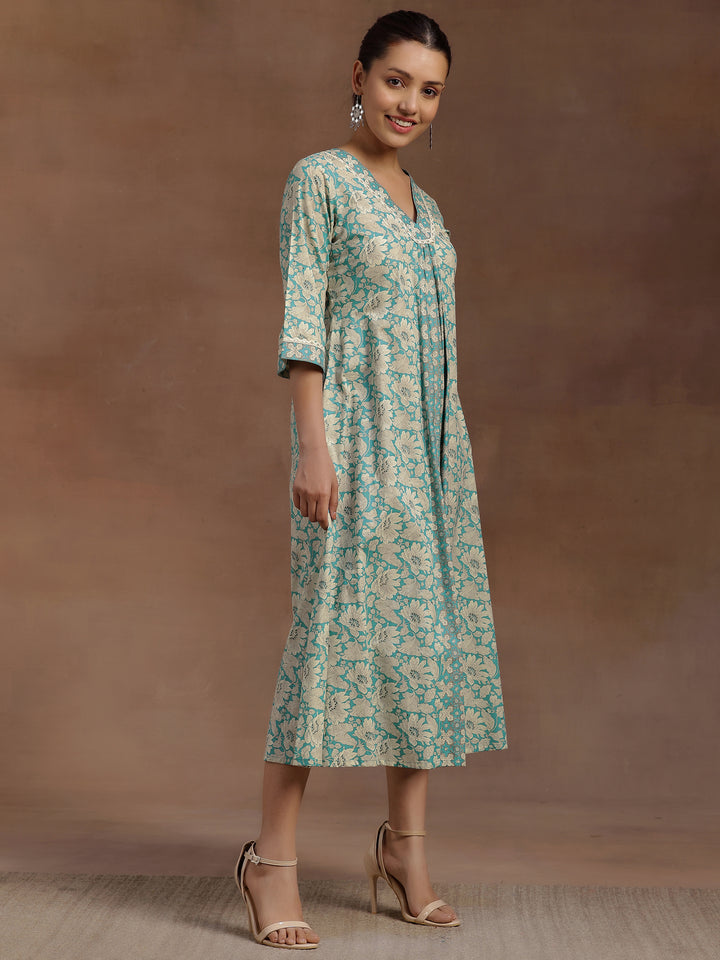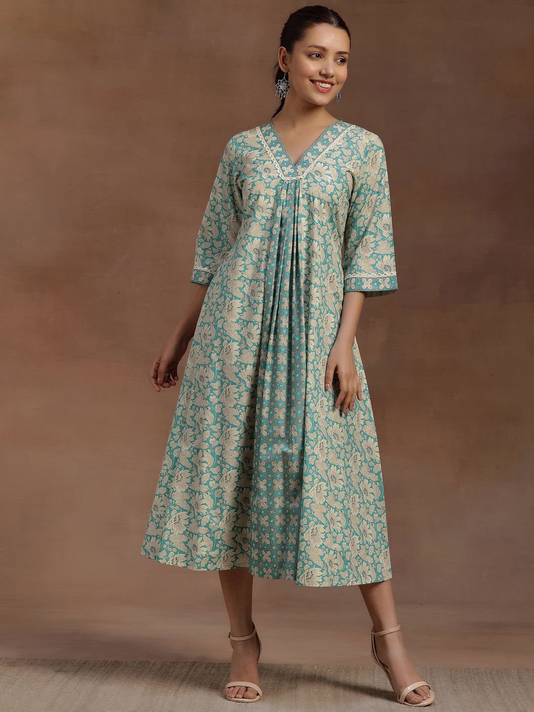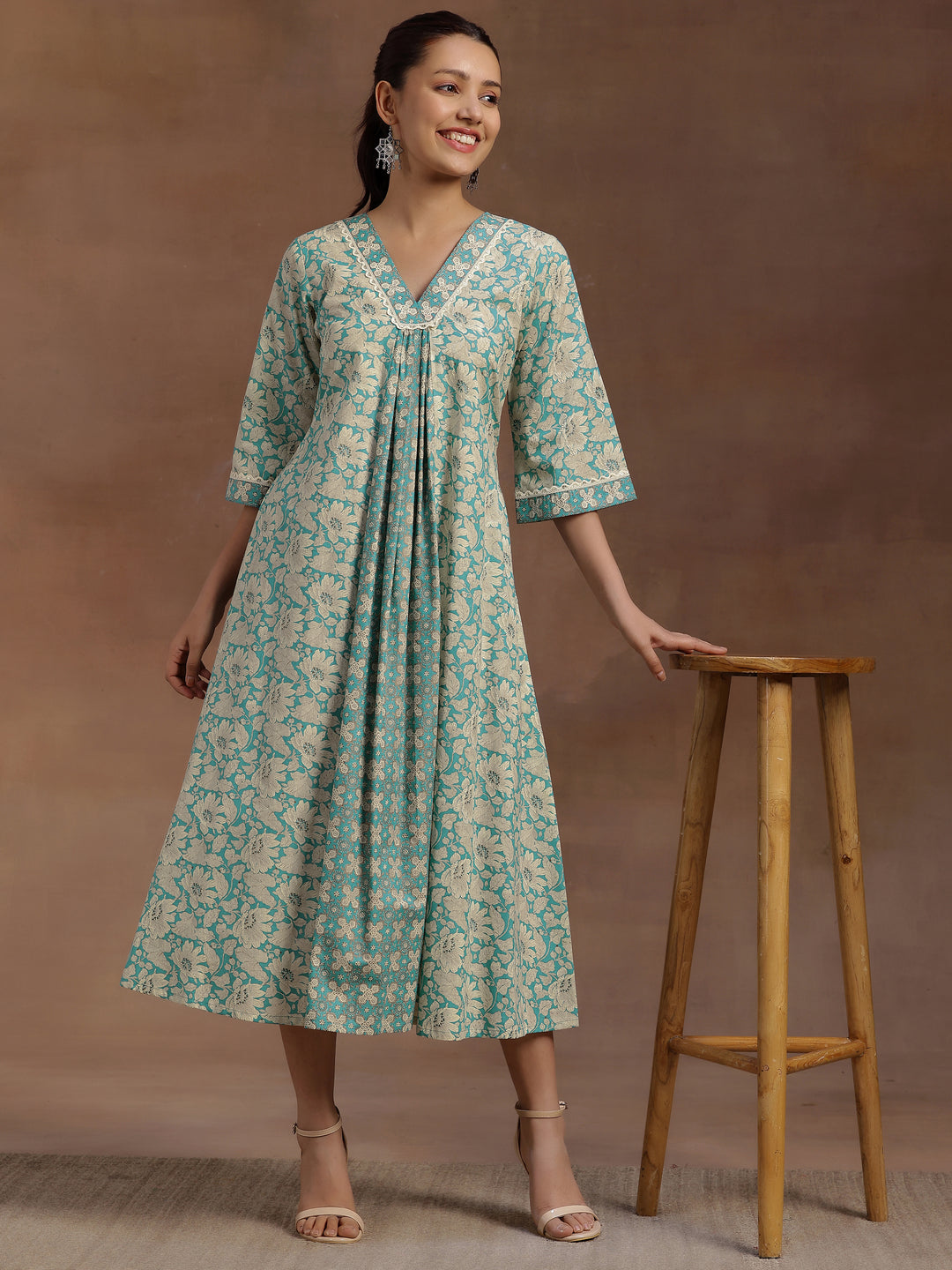 Our blue printed cotton A-line dress features a V-neckline and three-quarter sleeves. Highlighted with captivating floral prints, lace detailing and fabric-trim detailing, this style is perfect for casual outings.