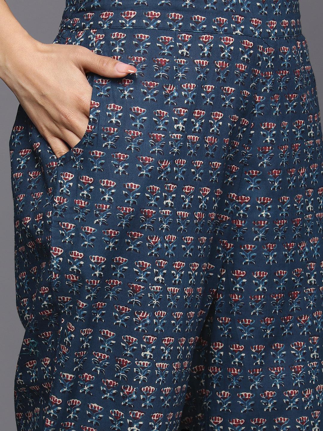 Our 2-piece blue printed cotton kurta set features a floral print straight-fit kurta with a notched neckline and three-quarter sleeves. Complemented with trousers with a partially elasticated waistband and roomy pockets. Adorned with handcrafted fabric buttons, fabric-trim accents, and Gota Patti detailing, this style is perfect for elevated everyday wear.