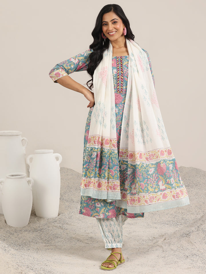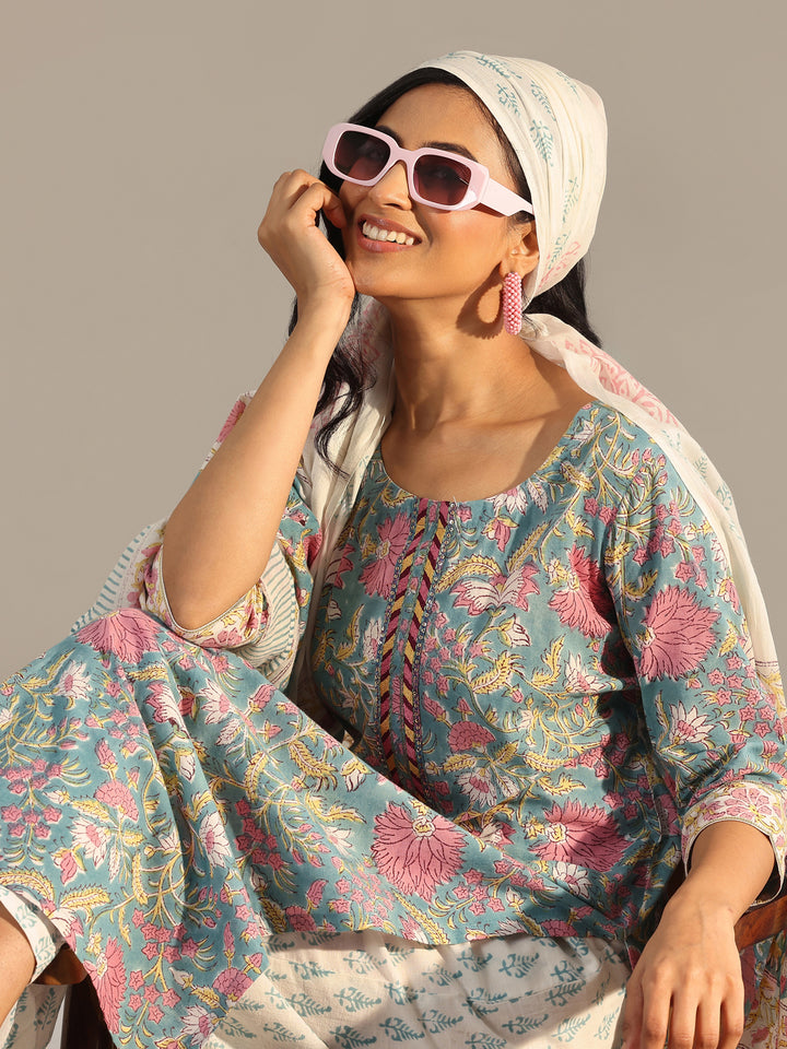 Our 3-piece blue printed cotton blend straight suit set features a kurta with a round neckline and three-quarter sleeves. Complemented with Salwar trousers with a partially elasticated waistband and roomy pockets, and a dupatta. Highlighted with sequins and thread work, this style is perfect for elevated everyday wear.