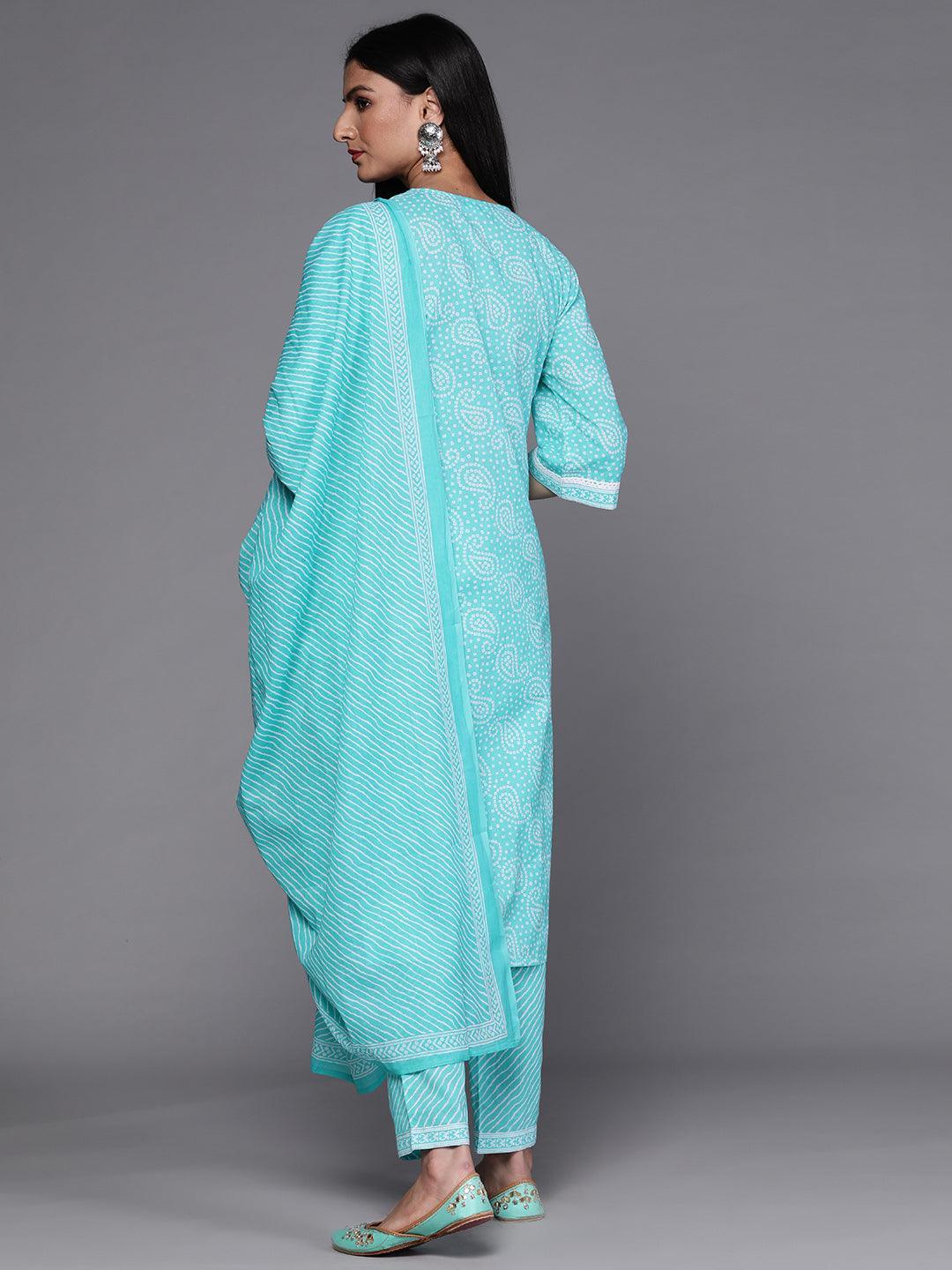 Our 3-piece blue Bandhani inspired print cotton suit set features a straight-fit kurta with a notched neckline, an embroidered statement yoke, and contrasting fabric and lace-trim accents on the flared sleeves, straight pants with a partially elasticated waistband and roomy pockets, and a dupatta in a complementing leheriya print. Perfect for elevated everyday wear.ÂÂÂÂÂÂÂÂÂ