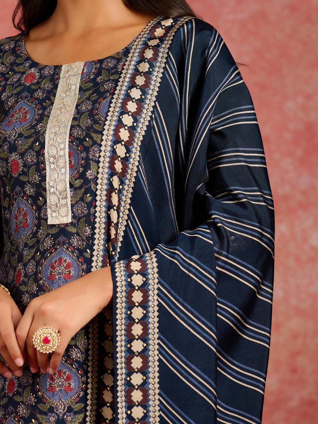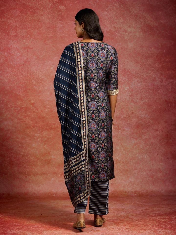 Blue Printed Silk Blend Straight Kurta With Trousers & Dupatta - ShopLibas