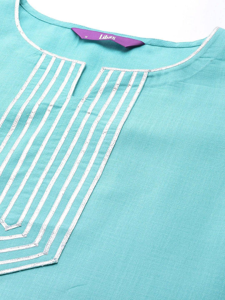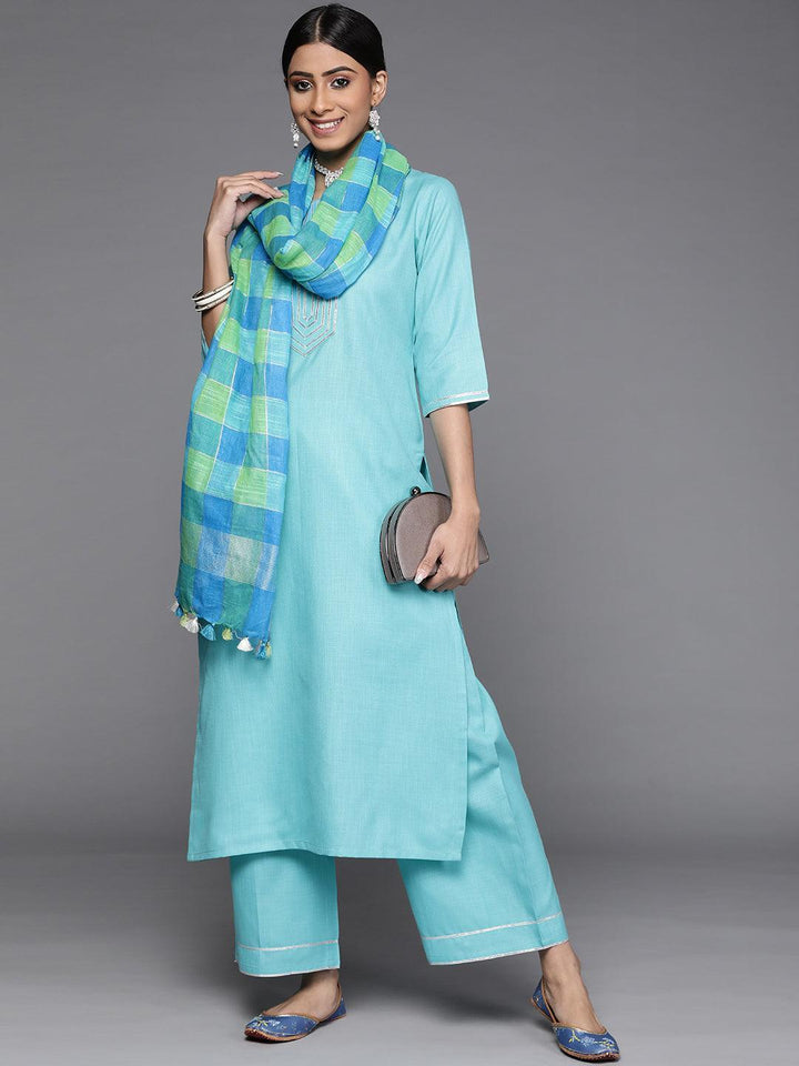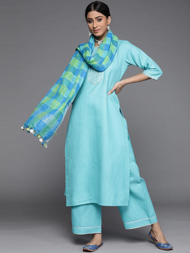 Our 3-piece blue solid colour cotton suit set features a straight fit kurta with a notched neckline, straight palazzo pants with a partially elasticated waistband and roomy pockets, and a contrasting dual-tone checkered print dupatta. Adorned with delicate Gota Patti accents, this cheerful style is perfect for elevated everyday wear.