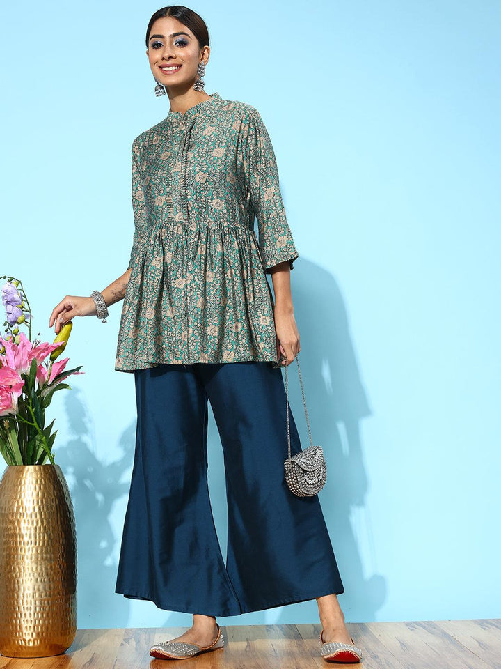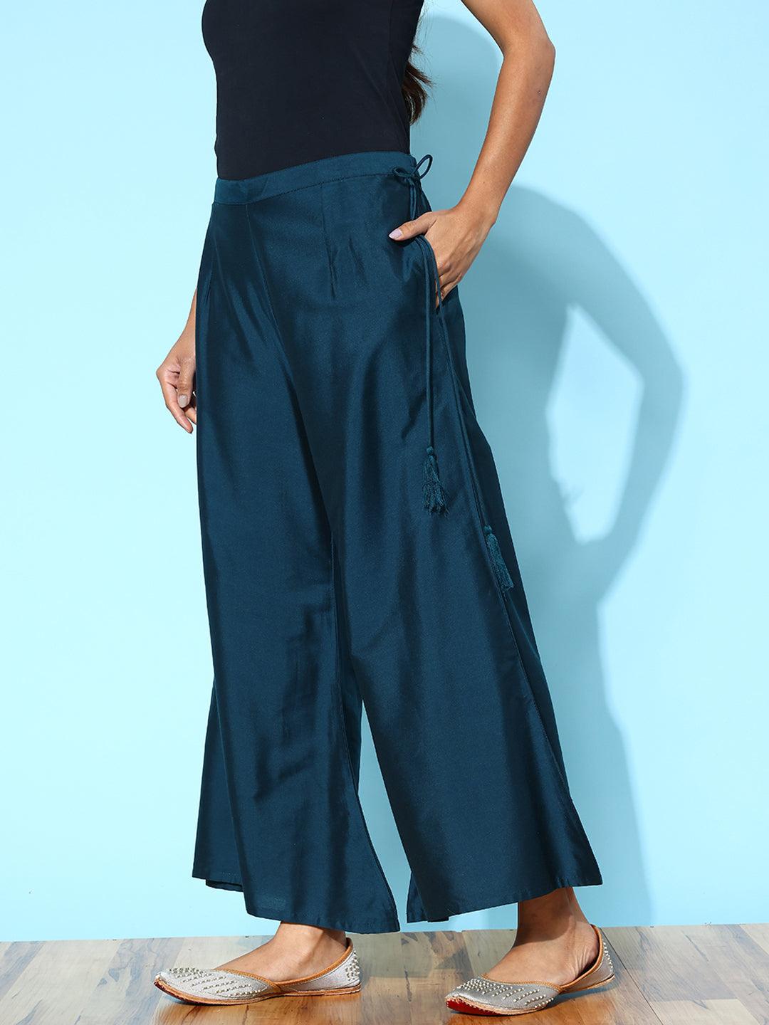 Our blue woven chic palazzo pants, made of silk fabric, feature a partially elasticated waist with a slip-on closure and 2 roomy pockets. Adorned with an elegant hem, this refreshing style is perfect for festivities.