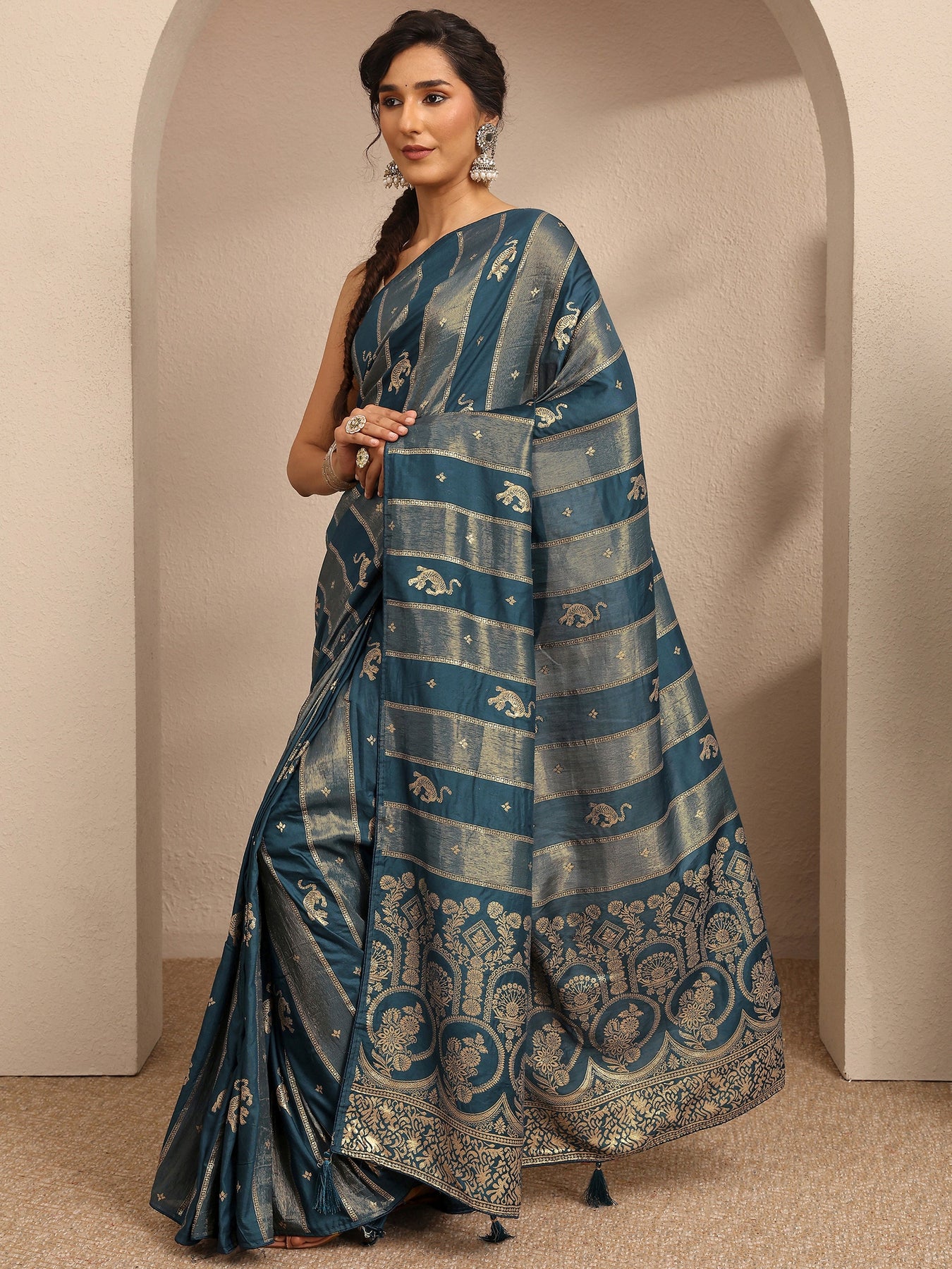 Blue Woven Design Banarsi Silk Blend Saree With Unstitched Blouse Piece