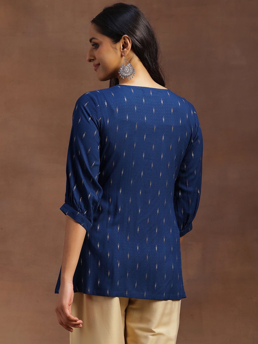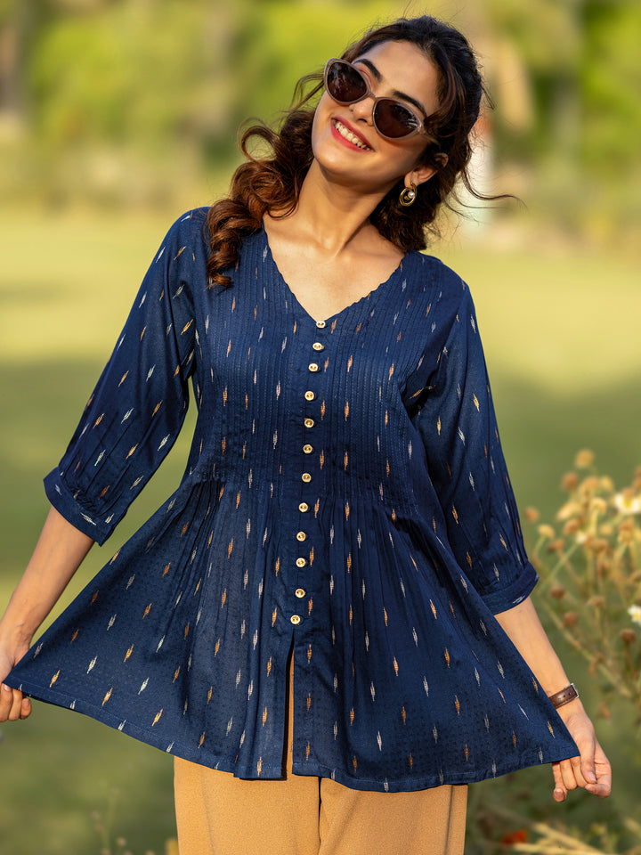Our blue woven design cotton blend A-line kurti features a V-neckline and three-quarter bishop sleeves. Adorned with pintuck detailing and stylish button accents, this style is perfect for casual outings.