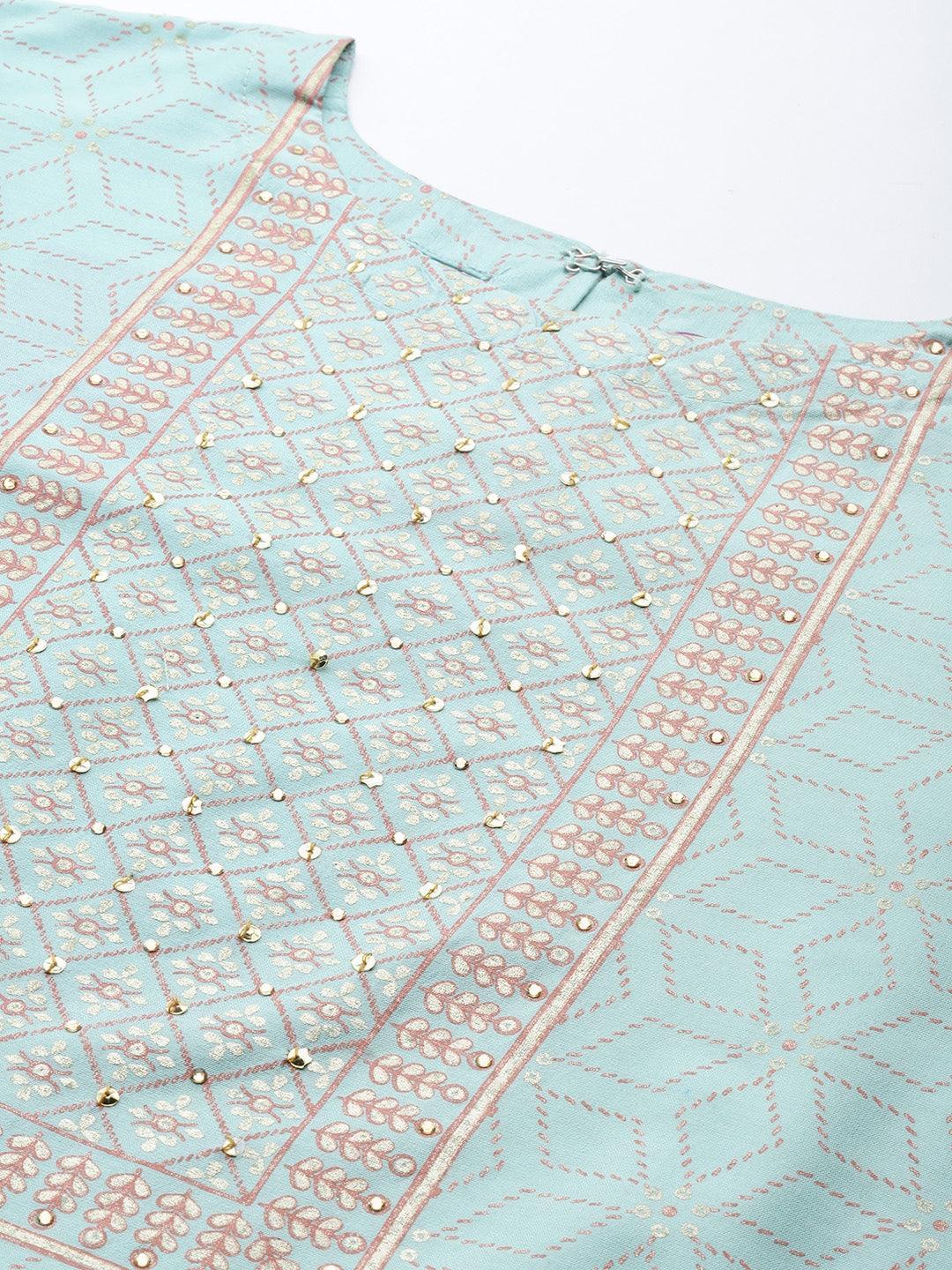 Our blue geometric print straight fit kurta, crafted in sumptuous Chanderi silk fabric features a high round neckline and three-quarter flared sleeves. Adorned with complementing fabric-trim accents and delicate sequins detailing, this elegant style is ideal for light festive occasions.