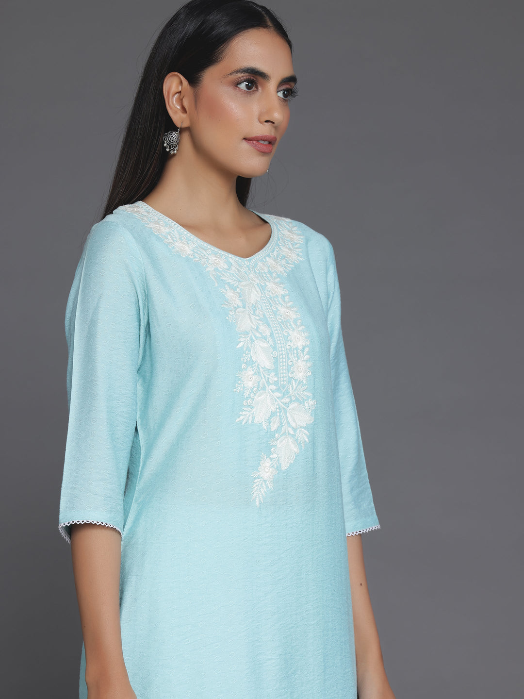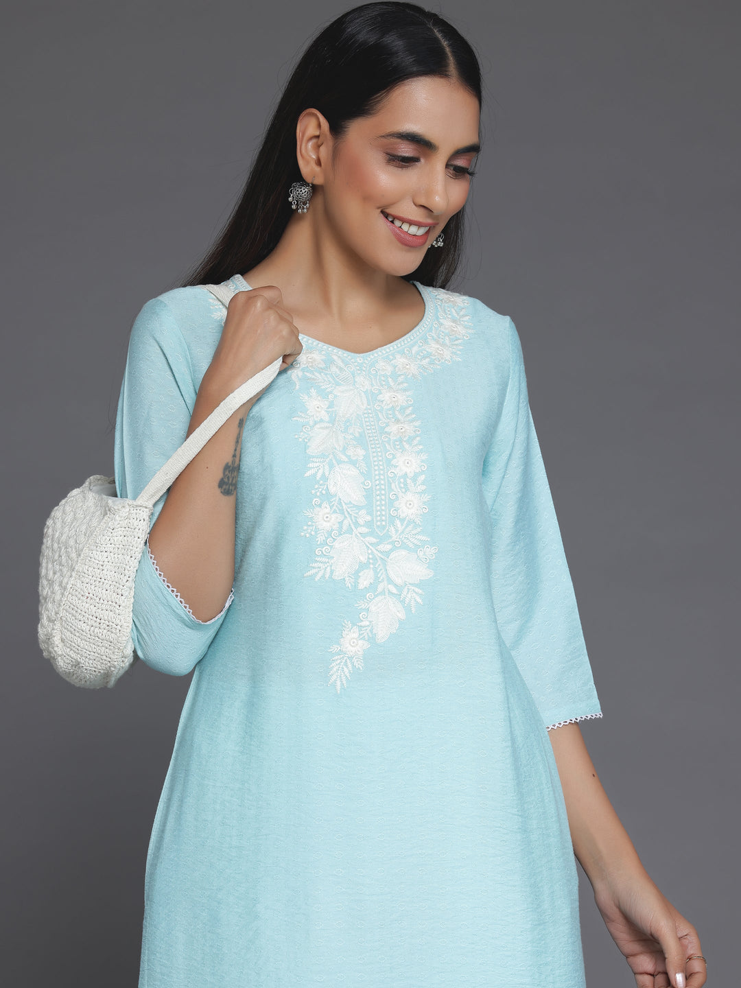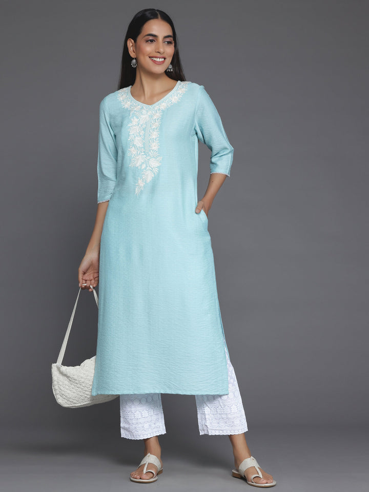 Our blue embroidered kurta, crafted in dobby silk fabric, features a straight silhouette with V-neckline, three-quarter sleeves, and a statement yoke. Highlighted with floral embroidery, sequins, lace detailing, and roomy pockets, this charming style is perfect for light festivities.