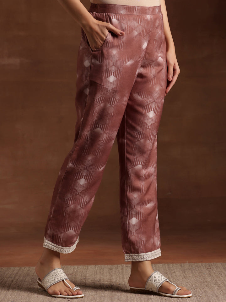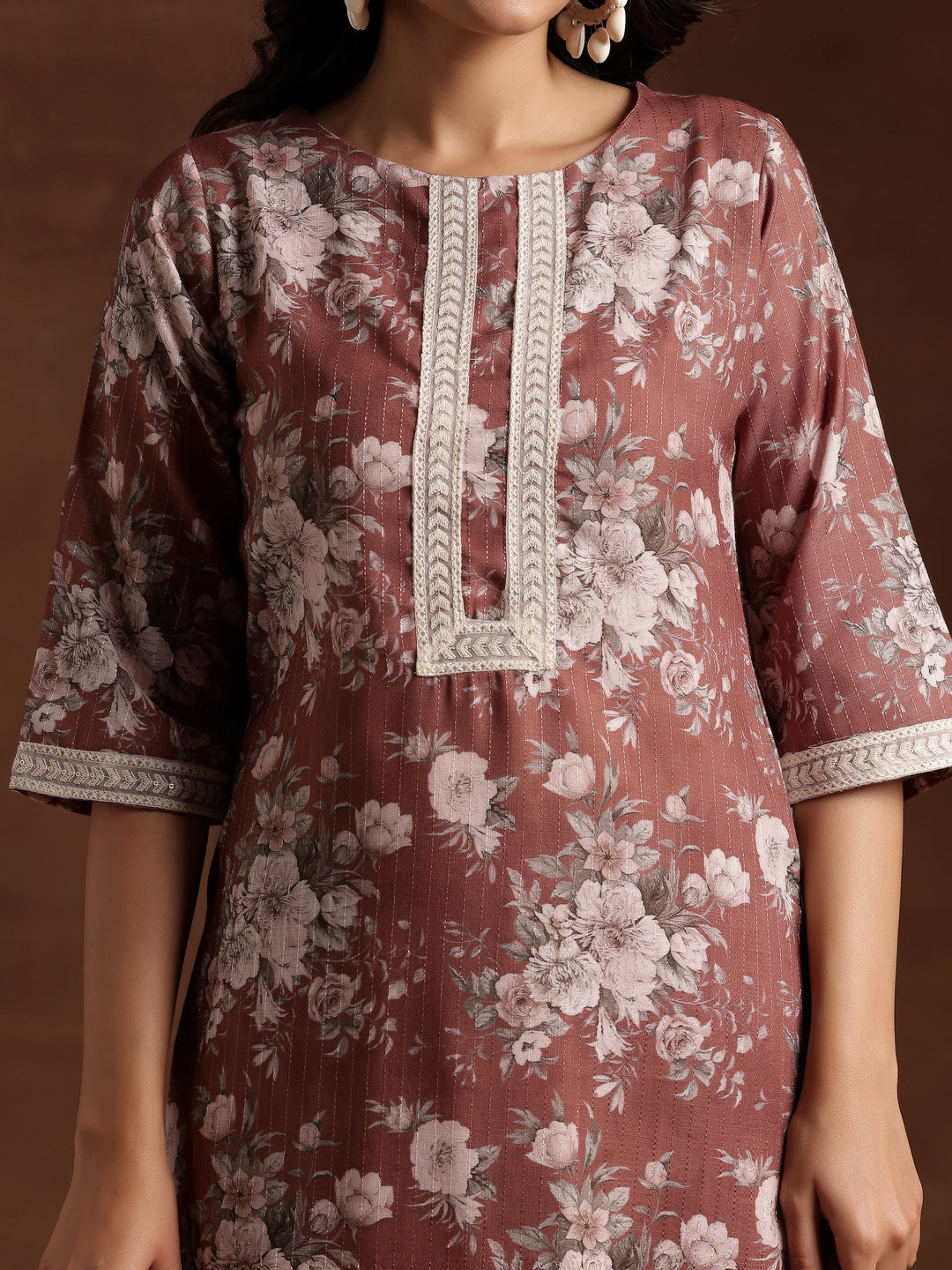 Our 3-piece brown printed cotton suit set features a straight-fit kurta with a round neckline and three-quarter sleeves. Complemented with trousers with a partially elasticated waistband and roomy pockets, and a dupatta. Elevated with lace detailing, this style is ideal for casual outings.