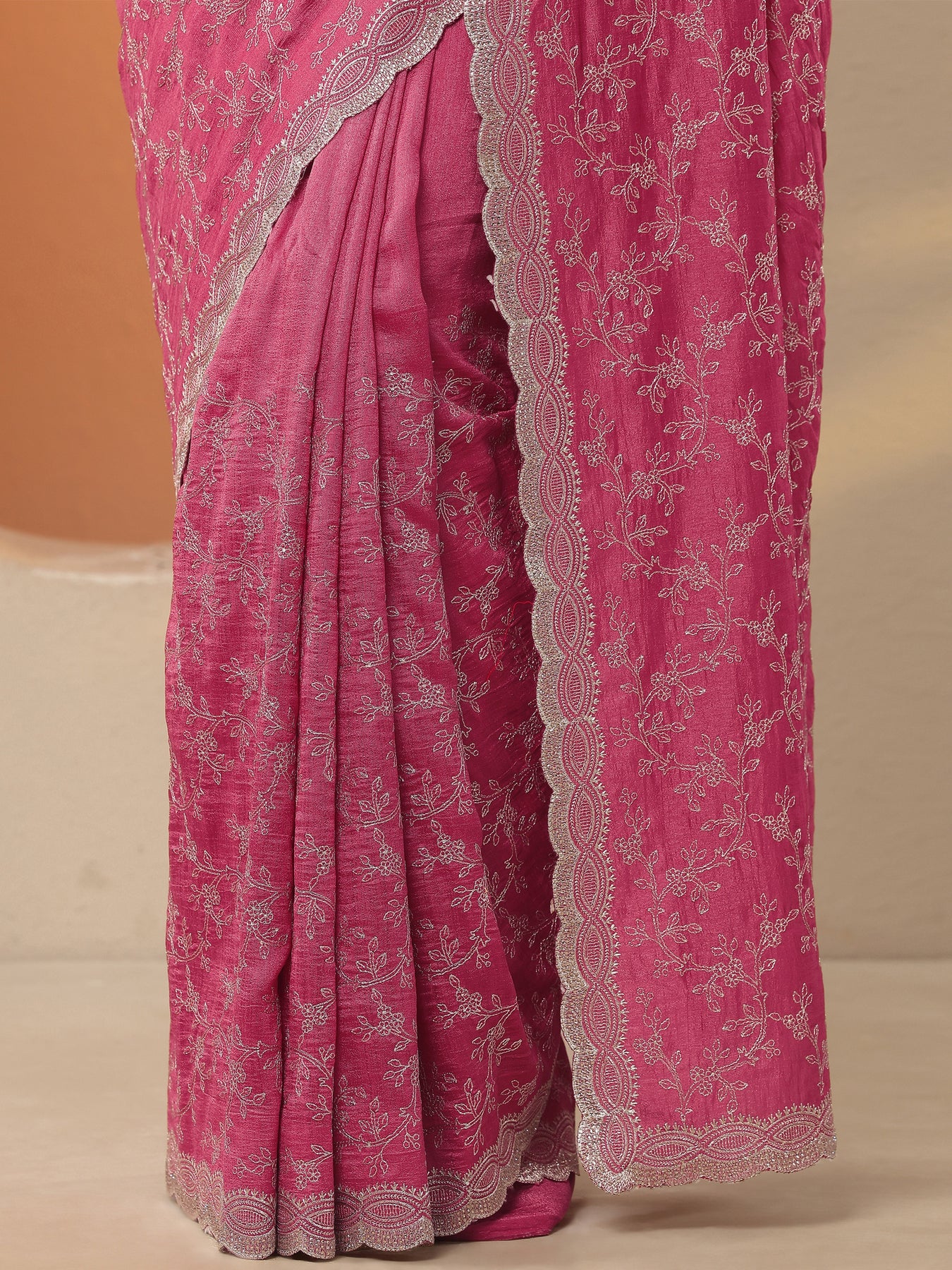 Coral Embroidered Silk Blend Saree With Unstitched Blouse Piece