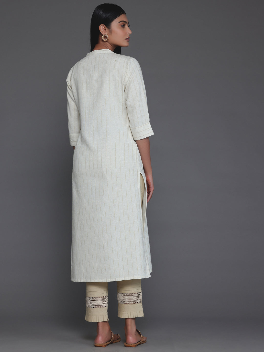 Our cream striped straight-fit kurta, crafted in dobby cotton, features a mandarin notched neckline and three-quarter sleeves. Elevated with pocket detailing and handcrafted fabric buttons, this style is perfect for work and beyond.