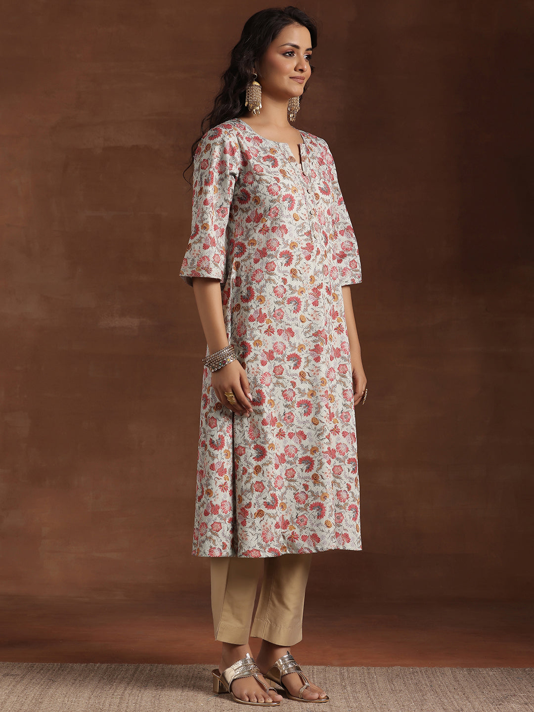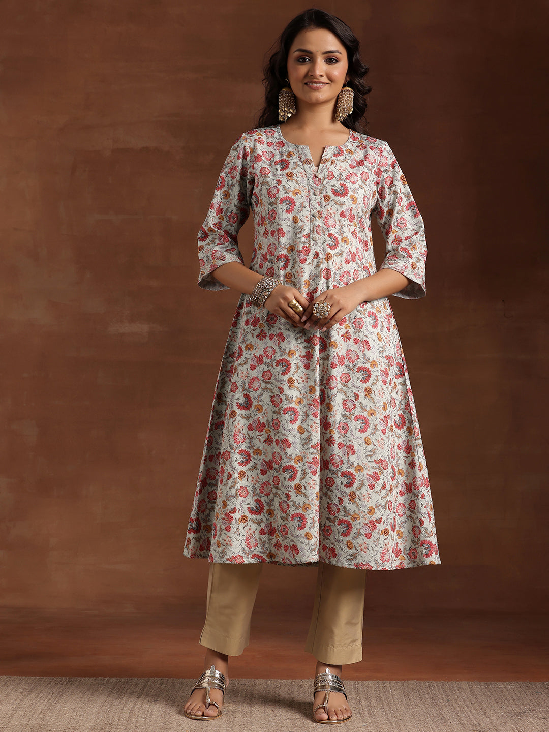 Our green printed cotton A-line kurta features a notched neckline and three-quarter flared sleeves. Adorned with floral prints and thread work and button accents, this style is perfect for casual outings.