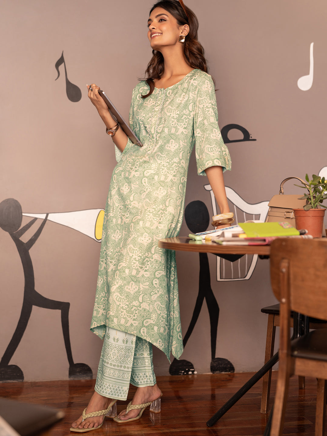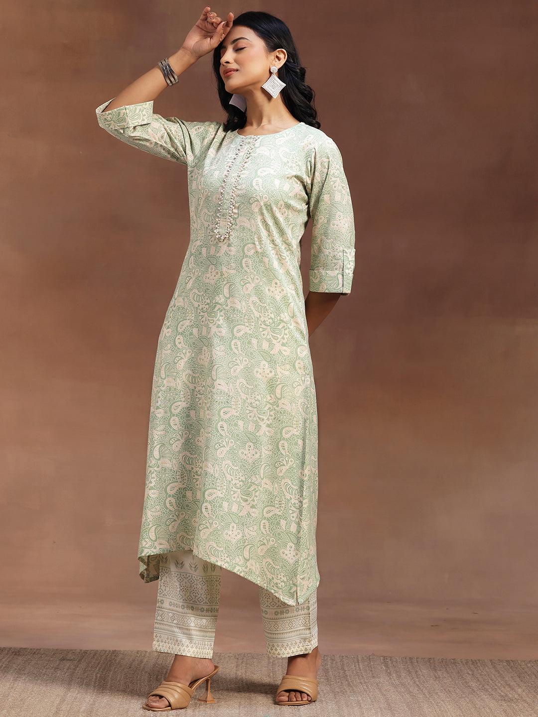 Our 2-piece green printed cotton blend kurta set features an asymmetrical kurta with a round neckline, three-quarter roll-up sleeves, and a statement yoke. Complemented with trousers with a partially elasticated waistband and roomy pockets. Adorned with beaded accents and fabric-trim accents, this style is perfect for casual outings.