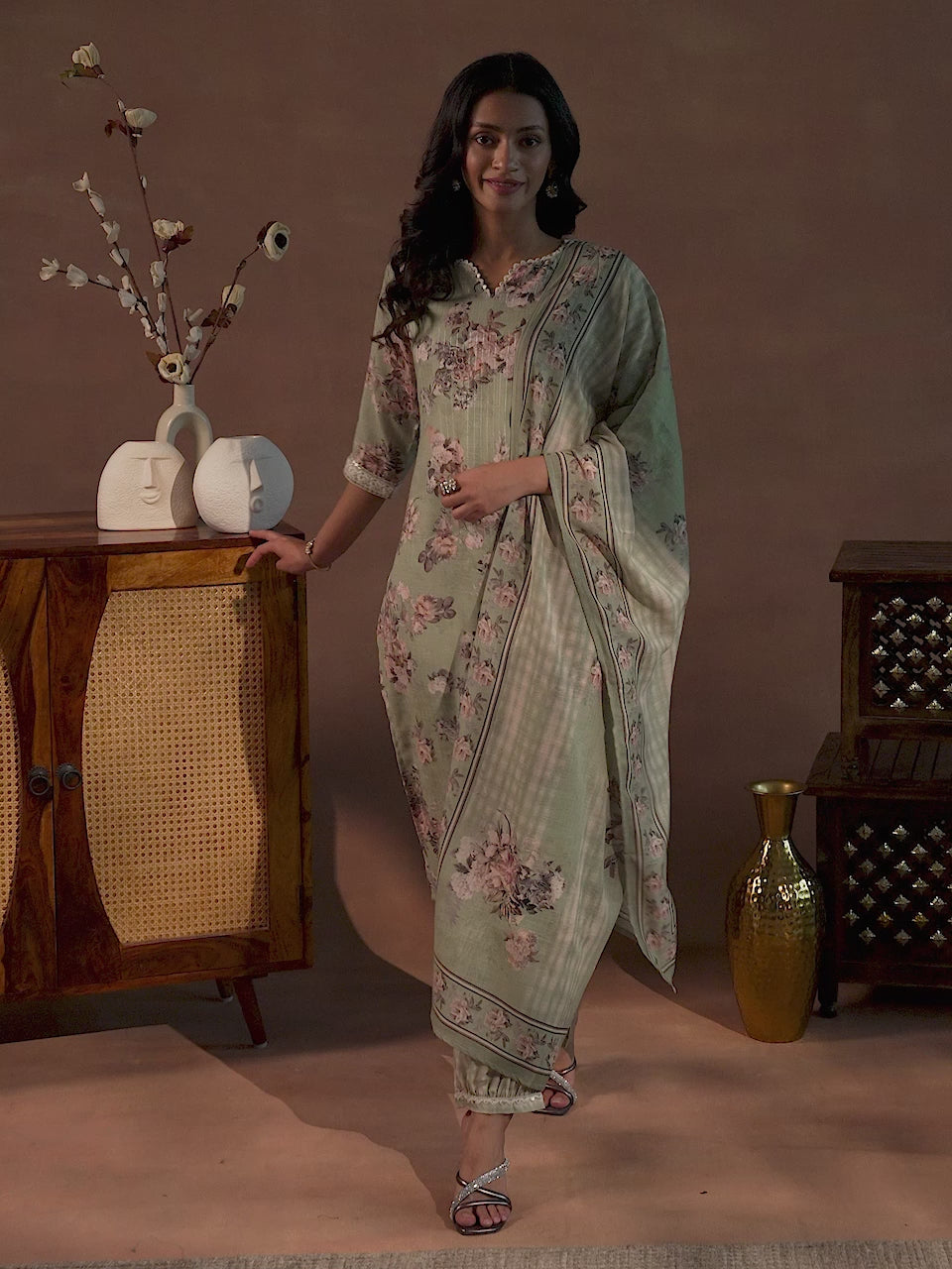 Our 2-piece green printed cotton kurta set features a floral print straight-fit kurta with a notched neckline and three-quarter sleeves. Complemented with hem-cuffed Salwar pants with a partially elasticated waistband and roomy pockets. Adorned with sequins, lace, and fabric-trim accents, this style is perfect for casual outings.