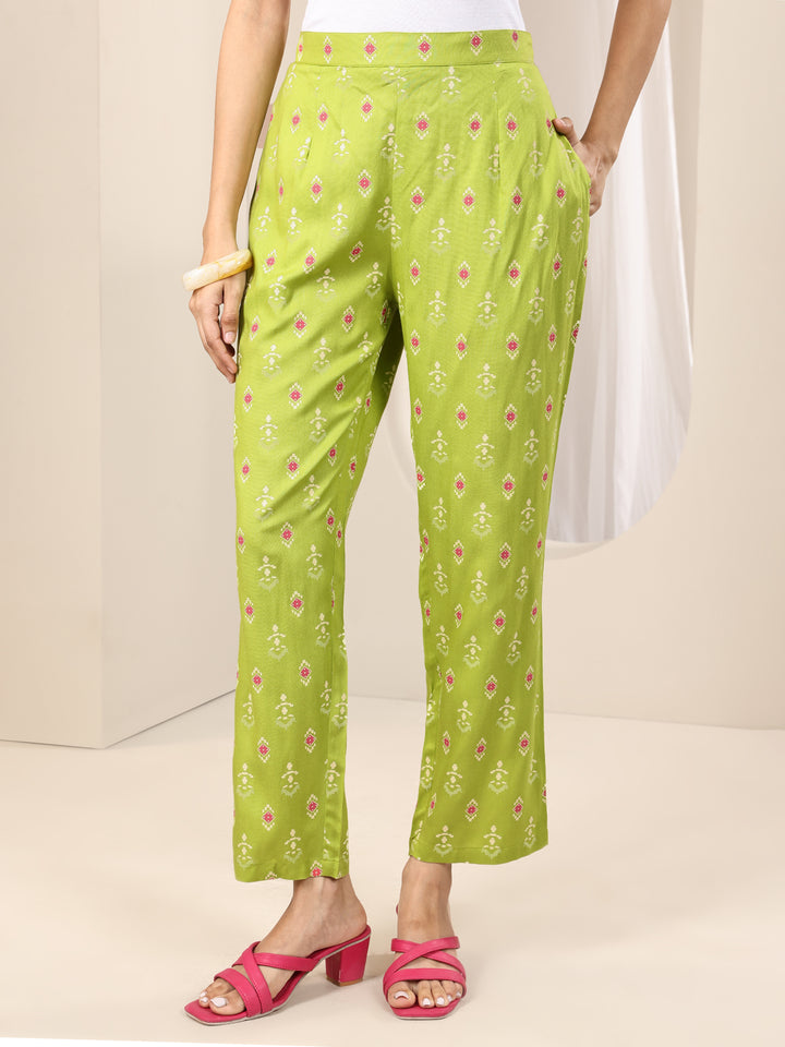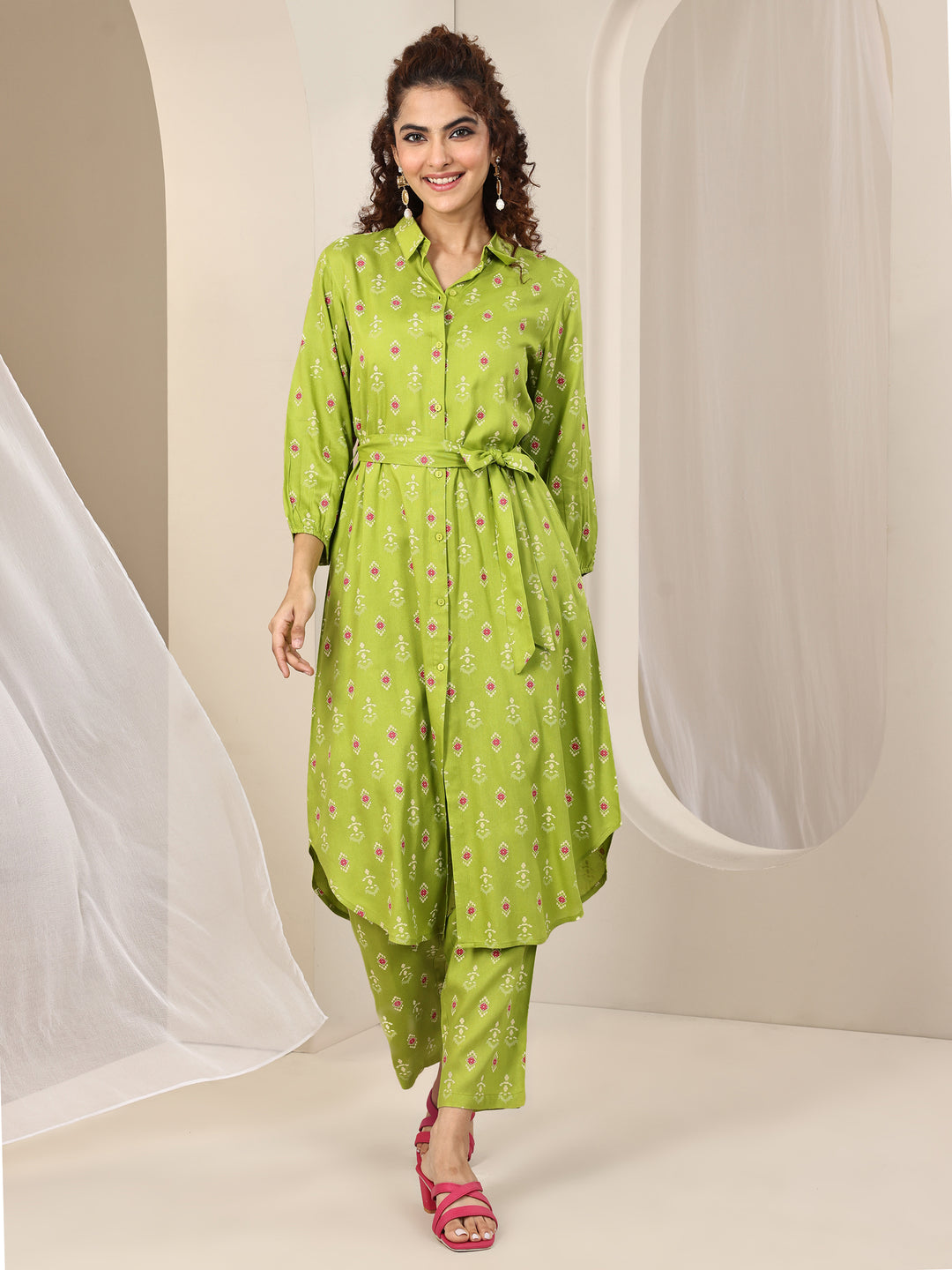 Our 2-piece Green Viscose Rayon suit set features a Straight-fit Kurta Set with a Mandarin Collar neckline, Regular Sleeves, and statement yoke. Complemented with Straight Pants with an Elasticated waistband. Adorned with Printed accents, this style is perfect for Casual occasions.