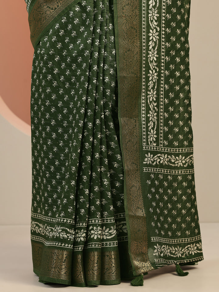 Green Printed Silk Blend Saree With Unstitched Blouse Piece