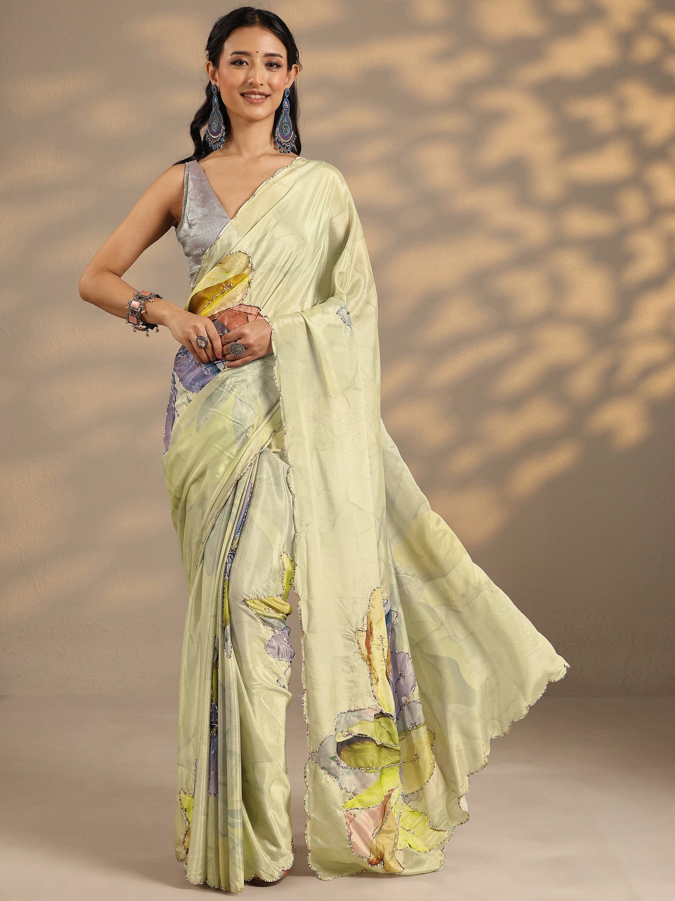 Green Printed Silk Blend Saree With Unstitched Blouse Piece
