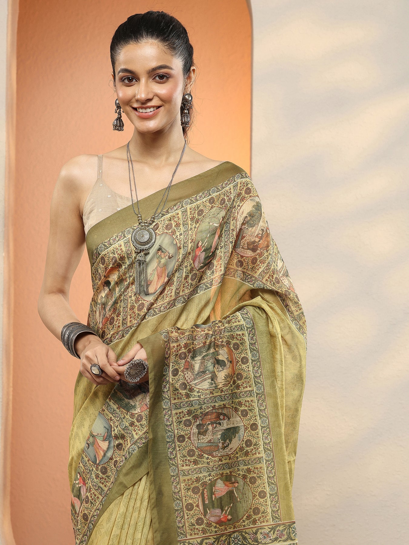 Green Printed Silk Blend Sarees With Unstitched Blouse Piece