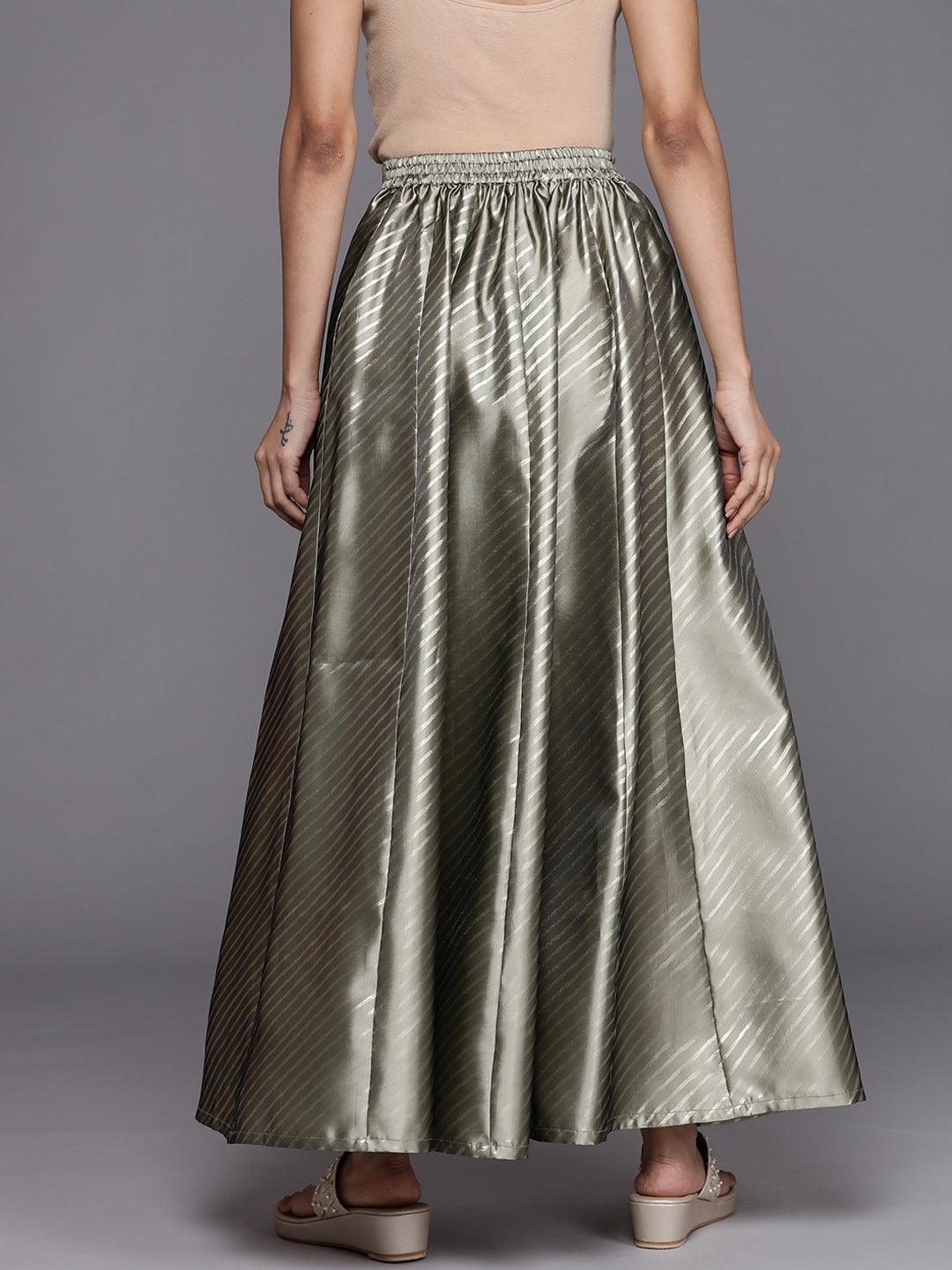 Our green and gold maxi length flared skirt, crafted in silk fabric features striped deisgn, gathered pleated detailing, and flared hem. Pair this with a matching kurti.