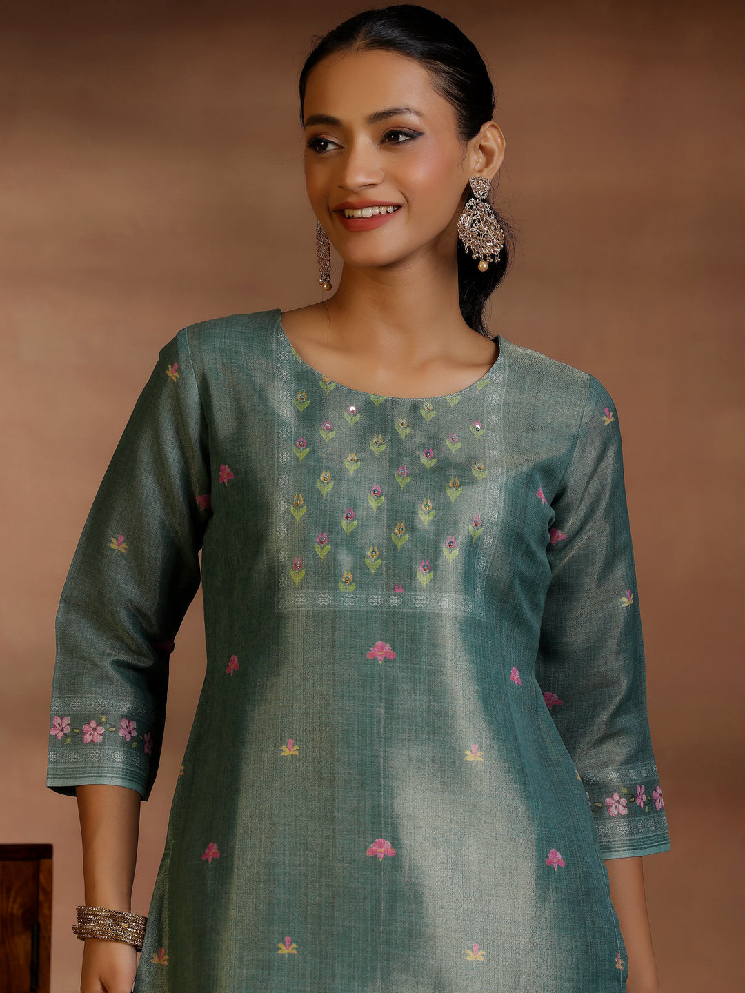 Our 3-piece green printed silk suit set features a straight-fit kurta with a round neckline, three-quarter sleeves, and a statement yoke. Complemented with straight-fit trousers with a fully elasticated waistband and roomy pockets, and a dupatta. Highlighted with captivating paisley prints and sequins, this style is perfect for light festivities.